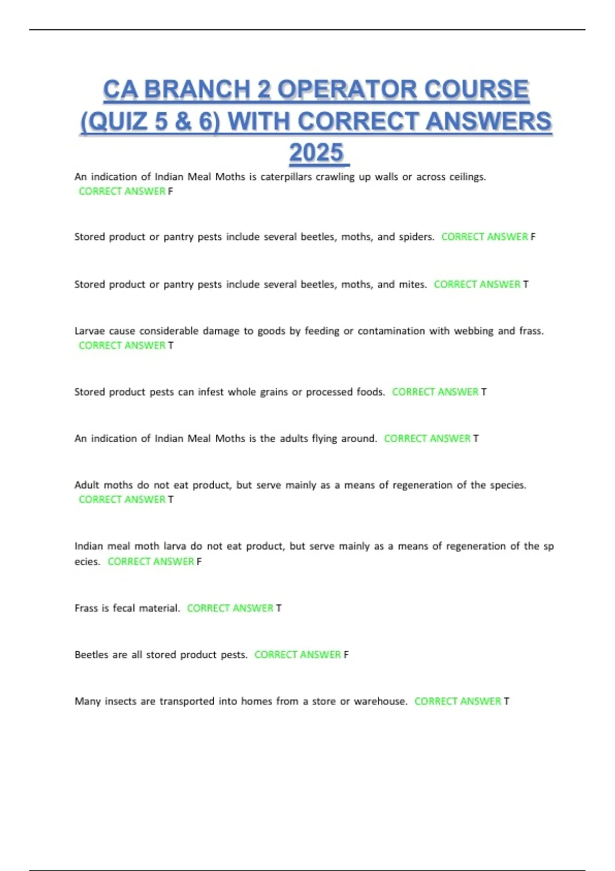 Stored product or pantry pests include several beetles, moths, and spiders. CORRECT ANSWER F