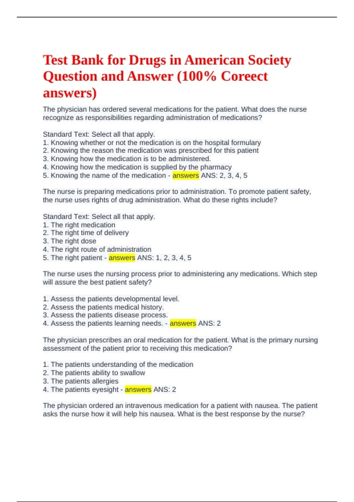 Test Bank for Drugs in American Society Question and Answer (100% Correct answers) Studyguide and a good exam preparation for A students