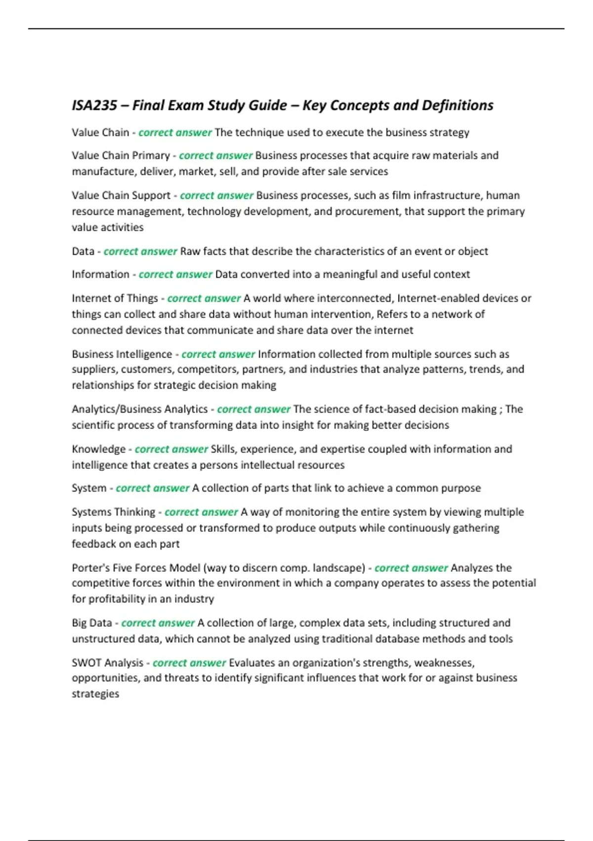 Value Chain - correct answer The technique used to execute the business strategy Value Chain Primary - correct answer Business processes that acquire raw materials and manufacture, deliver, market, sell, and provide after sale services Value Chain Support - correct answer Business processes, such as film infrastructure, human resource management, technology development, and procurement, that support the primary value activities Data - correct answer Raw facts that describe the characteristics of an event or object Information - correct answer Data converted into a meaningful and useful context Internet of Things - correct answer A world where interconnected, Internet-enabled devices or things can collect and share data without human intervention, Refers to a network of connected devices that communicate and share data over the internet Business Intelligence - correct answer Information collected from multiple sources such as suppliers, customers, competitors, partners, and industries that analyze patterns, trends, and relationships for strategic decision