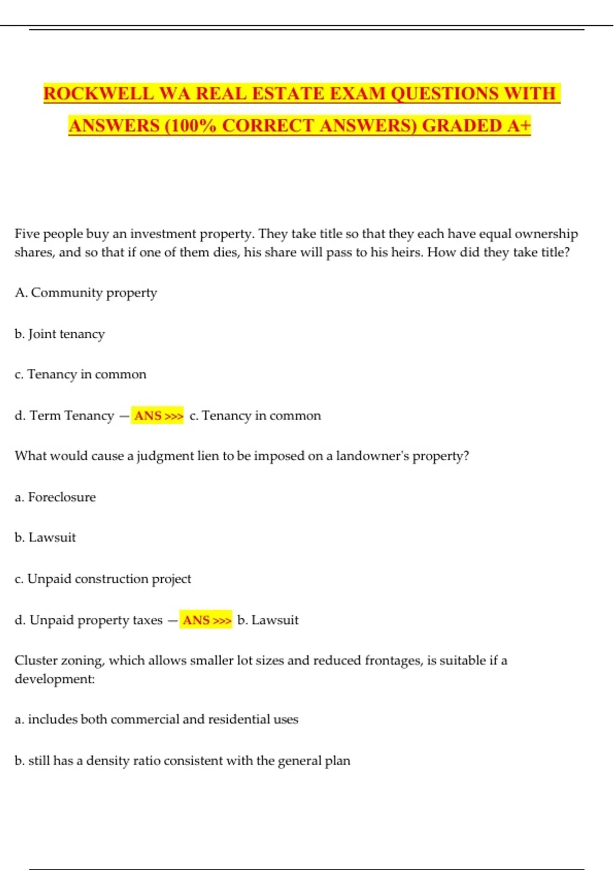 This document provides a fully verified set of Rockwell Washington Real Estate Exam questions and answers, covering all key topics including property ownership, contracts, financing, appraisal, agency relationships, and state-specific regulations. The material is structured to support comprehensive understanding and effective exam preparation, ensuring accurate answers and exam readiness.