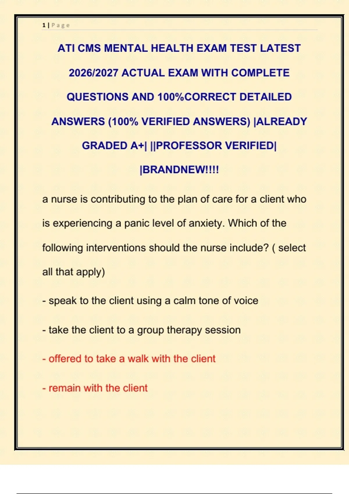 ATI CMS MENTAL HEALTH EXAM TEST LATEST 2026/2027 ACTUAL EXAM WITH COMPLETE QUESTIONS AND 100%CORRECT DETAILED ANSWERS (100% VERIFIED ANSWERS) |ALREADY GRADED A+| ||PROFESSOR VERIFIED| |BRANDNEW!!!!
