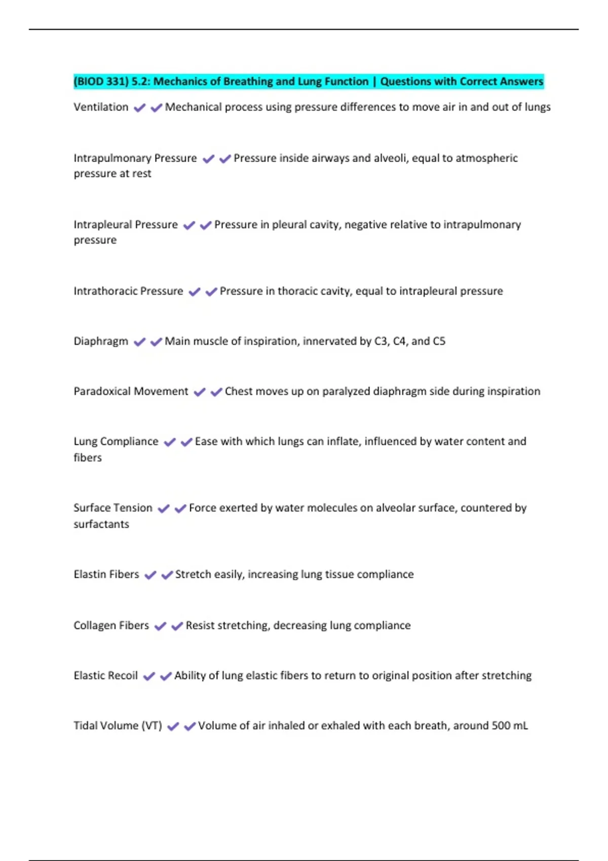(BIOD 331) 5.2: Mechanics of Breathing and Lung Function | Questions with Correct Answers