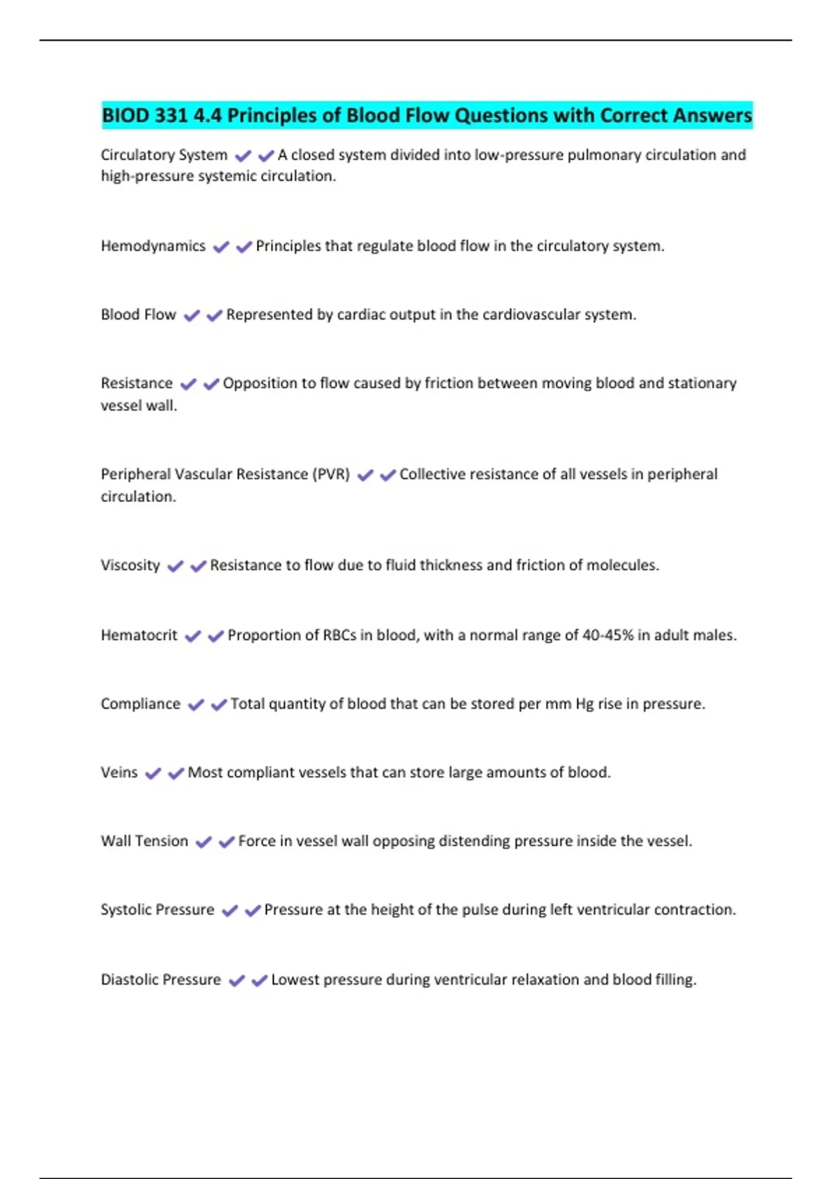 BIOD 331 4.4 Principles of Blood Flow Questions with Correct Answers