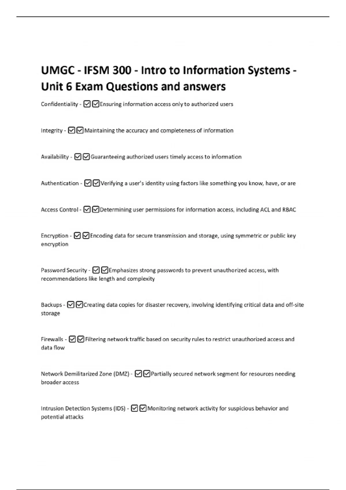 UMGC - IFSM 300 - Intro to Information Systems - Unit 6 Exam Questions and answers Confidentiality - Ensuring information access only to authorized users Integrity - Maintaining the accuracy and completeness of information Availability - Guaranteeing authorized users timely access to information Authentication - Verifying a user's identity using factors like something you know, have, or are Access Control - Determining user permissions for information access, including ACL and RBAC Encryption - Encoding data for secure transmission and storage, using symmetric or public key encryption