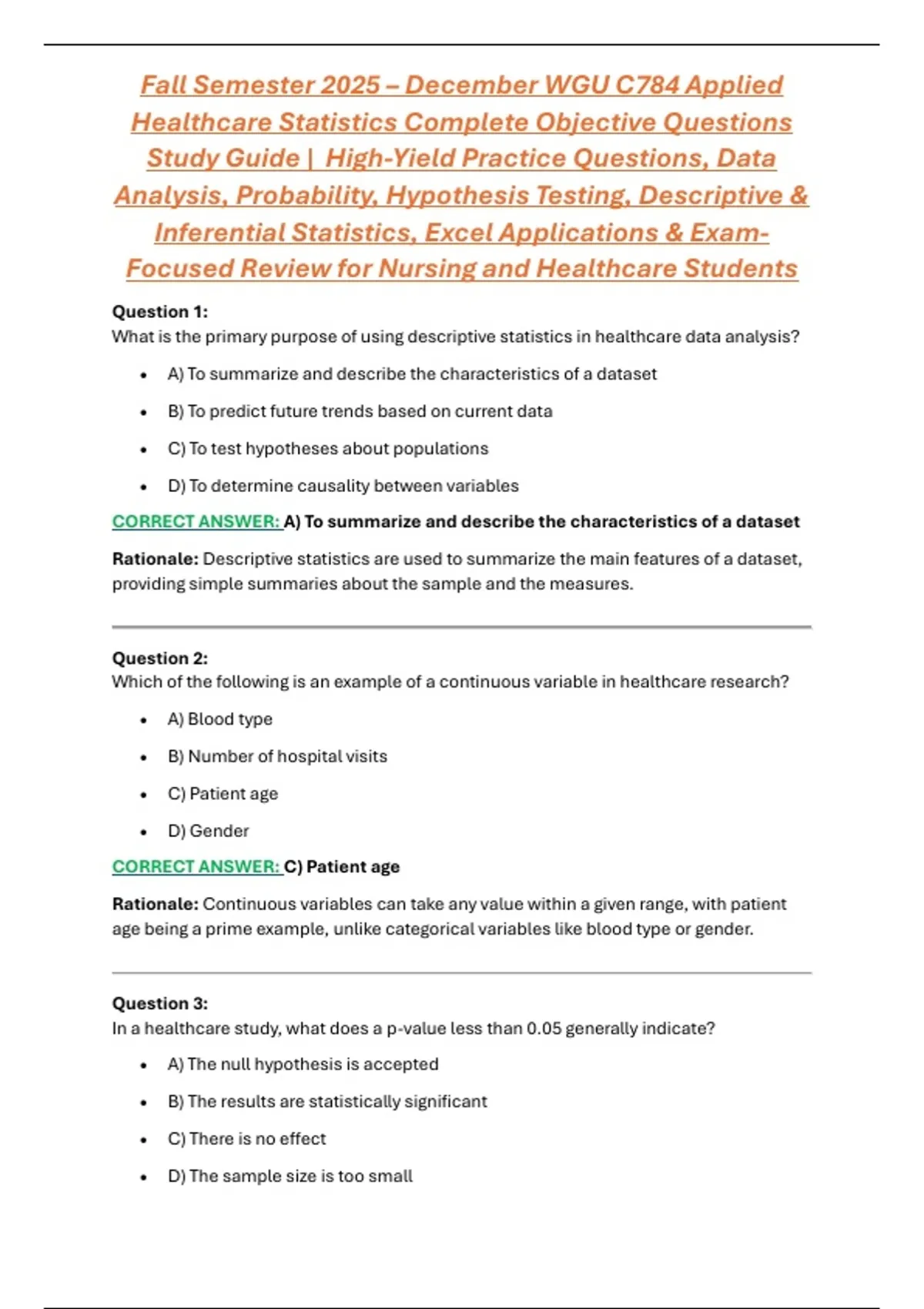 This Fall Semester 2025 – December WGU C784 Applied Healthcare Statistics Objective Questions Study Guide offers a comprehensive, exam-focused resource for nursing and healthcare students tackling WGU’s C784 course. It includes 300+ objective questions covering descriptive statistics, probability, hypothesis testing, correlation, regression, and inferential statistics, along with step-by-step solutions and Excel application examples. Designed for December study periods, midterms, and final exams, this guide simplifies complex statistical concepts, enhances data analysis skills, and provides high-yield practice that improves exam performance and practical application in healthcare research.