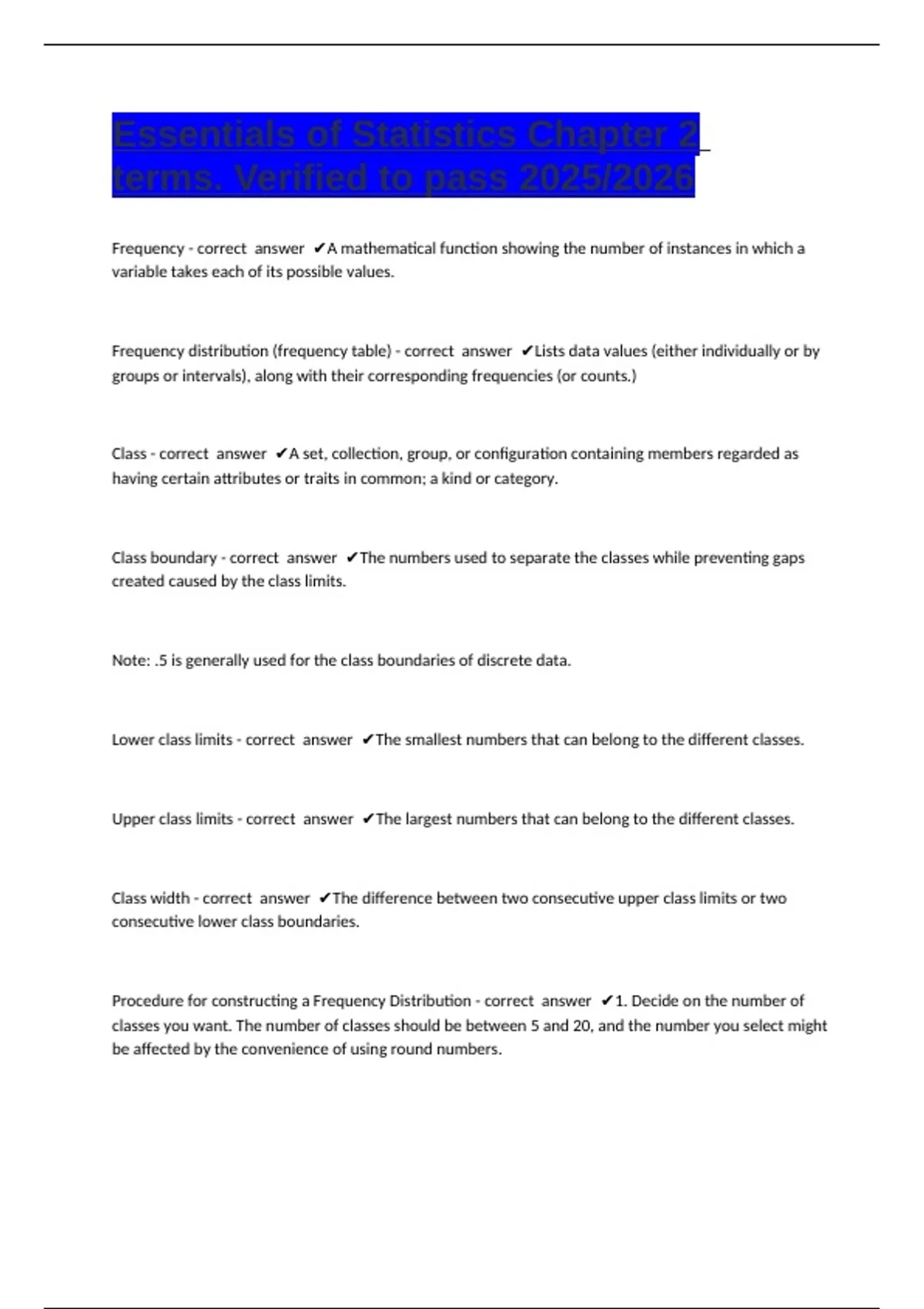 Essentials of Statistics Chapter 2 terms. Verified to pass 2025/2026 Frequency - correct answer A mathematical function showing the number of instances in which a variable takes each of its possible values. Frequency distribution (frequency table) - correct answer Lists data values (either individually or by groups or intervals), along with their corresponding frequencies (or counts.) Class - correct answer A set, collection, group, or configuration containing members regarded as having certain attributes or traits in common; a kind or category. Class boundary - correct answer The numbers used to separate the classes while preventing gaps created caused by the class limits