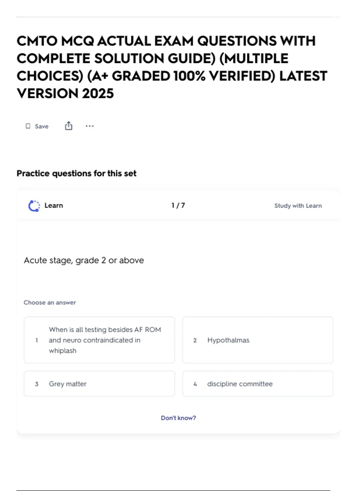 CMTO MCQ ACTUAL EXAM QUESTIONS WITH COMPLETE SOLUTION GUIDE) (MULTIPLE CHOICES) (A+ GRADED 100% VERIFIED) LATEST VERSION 2025