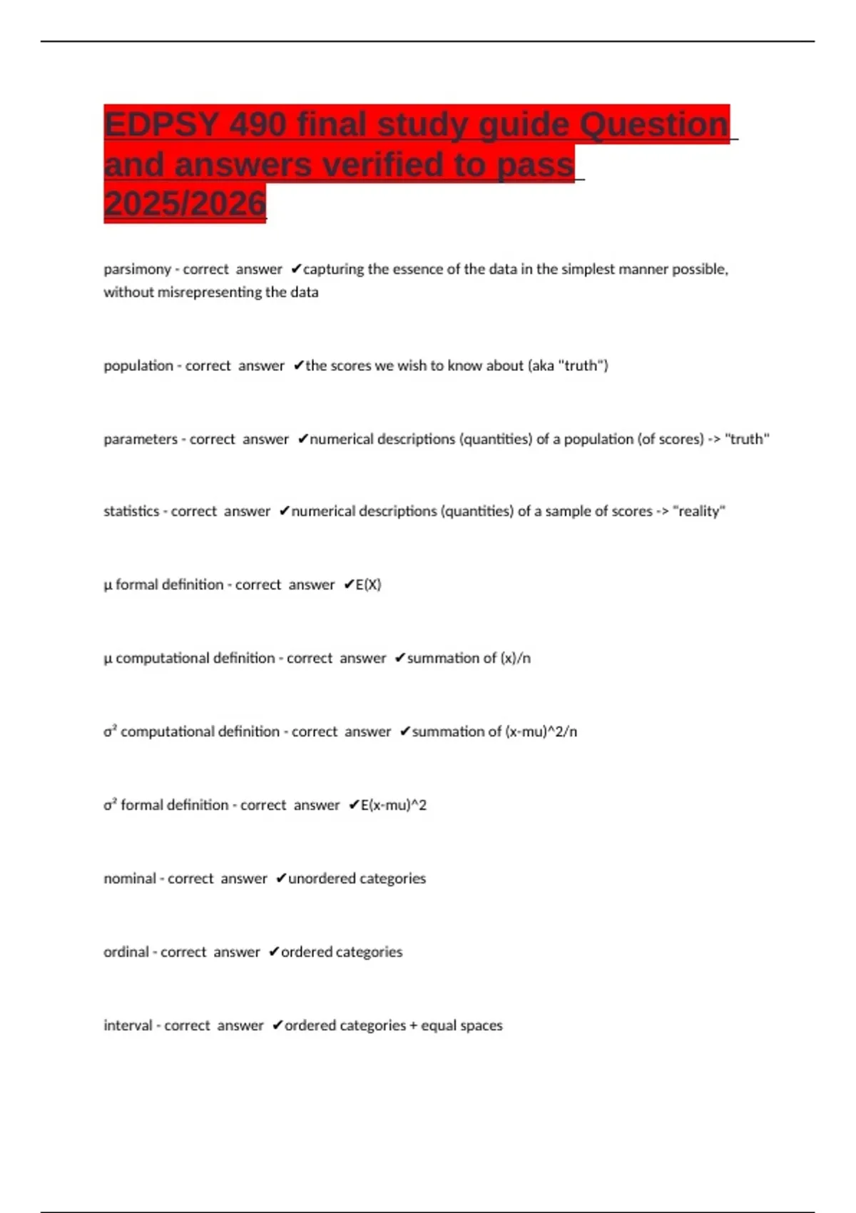 EDPSY 490 final study guide Question and answers verified to pass 2025/2026 parsimony - correct answer capturing the essence of the data in the simplest manner possible, without misrepresenting the data population - correct answer the scores we wish to know about (aka "truth") parameters - correct answer numerical descriptions (quantities) of a population (of scores) -> "truth" statistics - correct answer numerical descriptions (quantities) of a sample of scores -> "reality" µ formal definition - correct answer E(X) µ computational definition - correct answer summation of (x)/n σ² computational definition - correct answer summation of (x-mu)^2/n