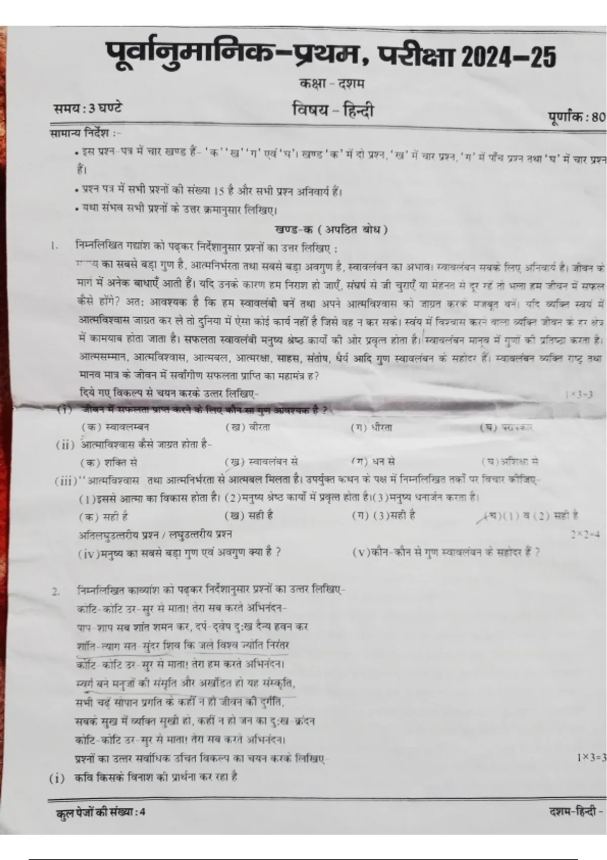 There is a Paper of CBSE class 10th Hindi Pre board 1st. This will help for practice.