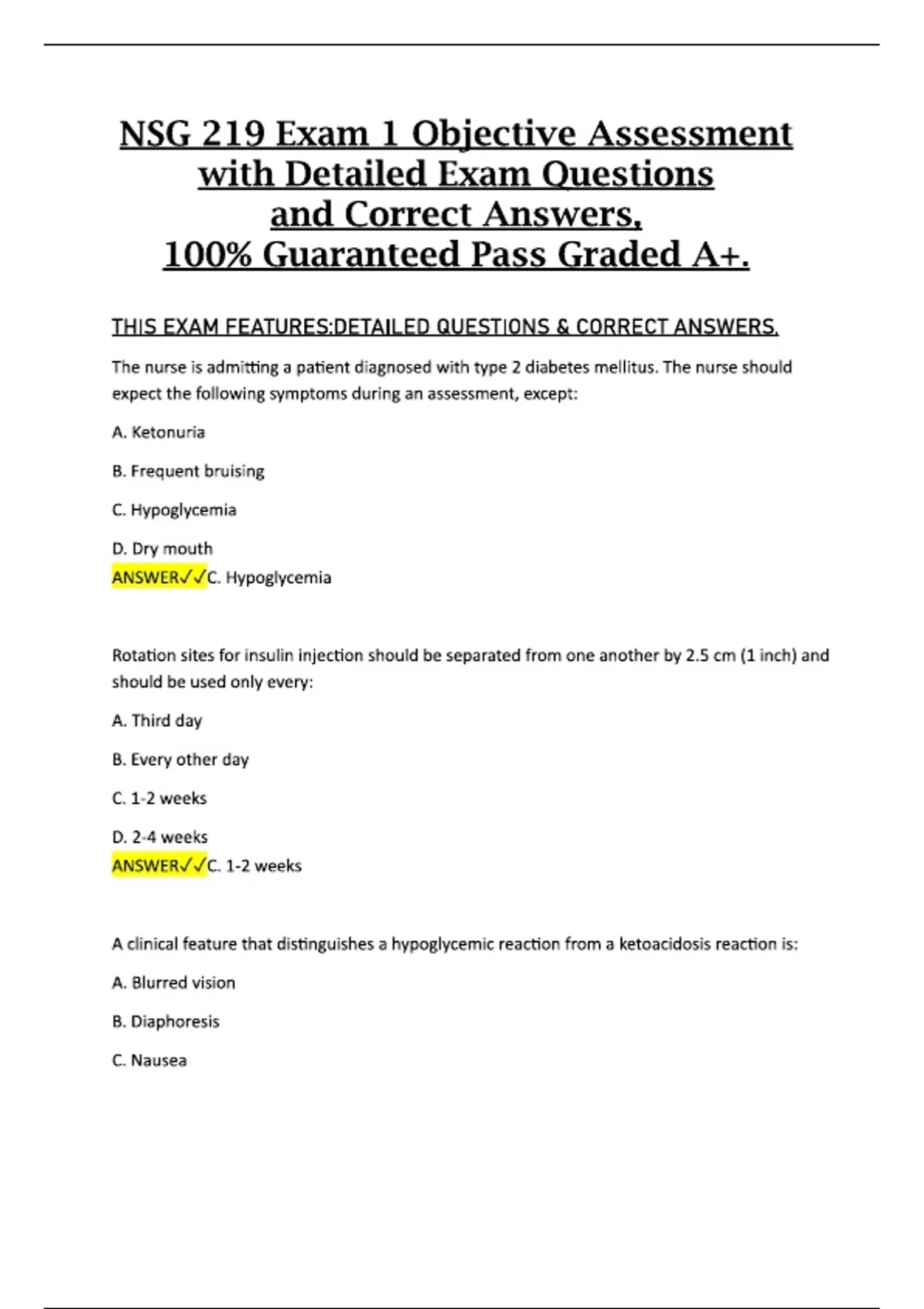 This document covers the full set of objective assessment topics for NSG 219 Exam 1, including detailed exam questions and their correct answers. It provides a comprehensive overview of key nursing concepts assessed in the first exam. The material is structured to support thorough exam preparation and reflects the core content typically emphasized in NSG 219 coursework.This document covers the full set of objective assessment topics for NSG 219 Exam 1, including detailed exam questions and their correct answers. It provides a comprehensive overview of key nursing concepts assessed in the first exam. The material is structured to support thorough exam preparation and reflects the core content typically emphasized in NSG 219 coursework.This document covers the full set of objective assessment topics for NSG 219 Exam 1, including detailed exam questions and their correct answers. It provides a comprehensive overview of key nursing concepts assessed in the first exam. The material is structured to support thorough exam preparation and reflects the core content typically emphasized in NSG 219 coursework.