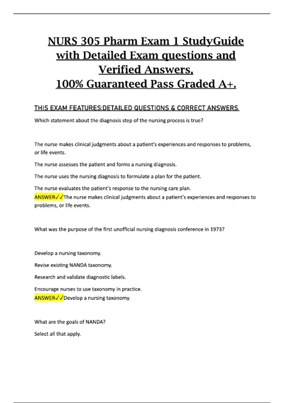 This document covers the core topics included in NURS 305 Pharmacology Exam 1, presenting detailed exam-style questions paired with verified correct answers. It provides a structured review of foundational pharmacology concepts commonly assessed in early course examinations. The material is designed to support efficient study and reinforce key principles required for safe medication practice.This document covers the core topics included in NURS 305 Pharmacology Exam 1, presenting detailed exam-style questions paired with verified correct answers. It provides a structured review of foundational pharmacology concepts commonly assessed in early course examinations. The material is designed to support efficient study and reinforce key principles required for safe medication practice.This document covers the core topics included in NURS 305 Pharmacology Exam 1, presenting detailed exam-style questions paired with verified correct answers. It provides a structured review of foundational pharmacology concepts commonly assessed in early course examinations. The material is designed to support efficient study and reinforce key principles required for safe medication practice.