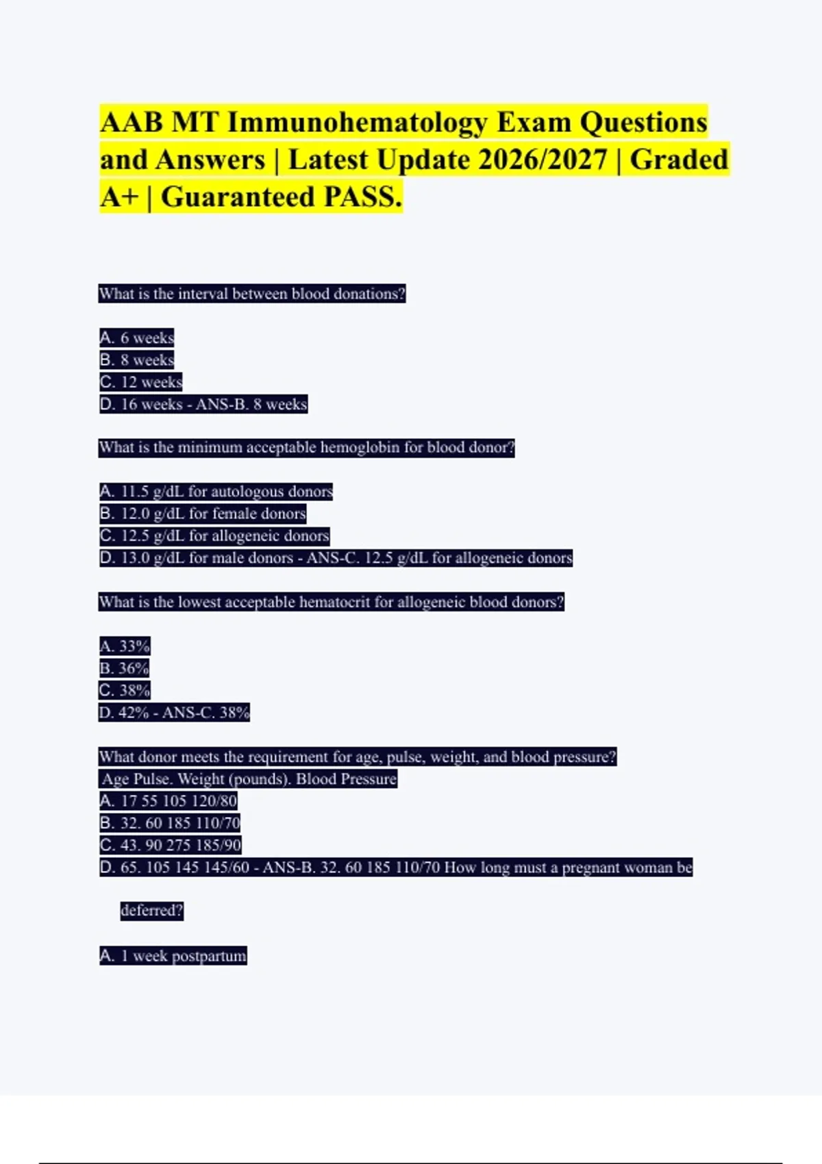 AAB MT Immunohematology Exam Questions and Answers | Latest Update 2026/2027 | Graded A+ | Guaranteed PASS. What is the interval between blood donations? A. 6 weeks B. 8 weeks C. 12 weeks D. 16 weeks - ANS-B. 8 weeks What is the minimum acceptable hemoglobin for blood donor? A. 11.5 g/dL for autologous donors B. 12.0 g/dL for female donors C. 12.5 g/dL for allogeneic donors D. 13.0 g/dL for male donors - ANS-C. 12.5 g/dL for allogeneic donors What is the lowest acceptable hematocrit for allogeneic blood donors? A. 33% B. 36% C. 38% D. 42% - ANS-C. 38% What donor meets the requirement for age, pulse, weight, and blood pressure? Age Pulse. Weight (pounds). Blood Pressure A. /80 B. 32. /70 C. 43. /90 D. 65. /60 - ANS-B. 32. /70 How long must a pregnant woman be deferred? A. 1 week postpartum B. 4 weeks postpartum C. 6 weeks postpartum D. 8 weeks postpartum - ANS-C. 6 weeks postpartum There is a 12 month deferment for each of the following donors EXCEPT which one? A. Donor received a blood transfusion B. Donor received a tattoo and body piercing C. Donor had sex with a person with hepatitis D. Donor received the hepatitis B vaccine - ANS-D. Donor received the hepatitis B vaccine How long must a prospective donor with a history of malaria be deferred? A. permanently B. 3 years after cessation of treatment C. 12 months after cessation of treatment D. no deferral - ANS-B. 3 years after cessation of treatment A lab tech who has a positive tuberculin skin test wants to donate blood. If he/she meets all the other criteria, how long is the deferral? A. no deferral as long as there is no other abnormality B. temporary deferral for 12 months after completion of therapy C. temporary deferral for 3 years after completion of treatment D. permanent deferral - ANS-A. no deferral as long as there is no other abnormality All of the following are causes of permanent donor deferral EXCEPT which one? A. confirmed HIV positive B. family history of Creutzfeldt-Jakob disease C. intravenous drug user D. incarcerated individual - ANS-D. incarcerated individual What is the length of deferral for symptom-free donors immunized with oral polio, measles (rubeola), or mumps vaccine? A. 2 weeks B. 4 weeks C. 6 weeks D. 12 months - ANS-A. 2 weeks Current testing on all donor blood must include testing for which of the following? A. direct antiglobulin test B. complete Rh phenotyping C. serological test for syphilis D. serological test for cytomegalovirus - ANS-C. serological test for syphilis Which one of the following test is not required by AABB and is therefore optional during donor blood testing? A. RPR B. anti-HIV C. anti-HTLV D. anti-HBc - ANS-D. anti-HBc The oral temperature of a donor must not exceed which value? A. 37.0 ° C B. 37.5 ° C C. 98.6 ° F D. 99.0 ° F - ANS-B. 37.5 ° C What is a commonly used screening method for the detection of HIV-1 antibodies? A. latex agglutination B. radioimmunoassay C. nucleic acid techniques D. enzyme-linked immunosorbent assays - ANS-D. enzyme-linked immunosorbent assays Currently required viral hepatitis marker tests include all of the following EXCEPT which one? A. anti-HAV B. anti-HCV C. anti-HBc D. HBsAg - ANS-A. anti-HAV When color coding is used for donor blood labels, what color is group A? A. yellow B. pink C. blue D. black/gray/white - ANS-A. yellow In the very early acute phase of hepatitis, which one of the following positive test would be indicative of onset of a viremic state? A. HBsAg B. HBeAg C. anti-HBc D. anti-HBs - ANS-A. HBsAg During the "window period," what is the only marker of HBV infection? A. HBsAg B. HBeAg C. anti-HBc D. anti-HBs - ANS-C. anti-HBc What is the minimum length of time that the patient's serum must remain positive for HBsAg before the individual is referred to as a chronic carrier? A. 3 months B. 6 months C. 1 year D. 3 years - ANS-B. 6 months Which viral agent causes the majority of cases of transfusion-associated hepatitis? A. HAV B. HBV C. HCV D. HDV - ANS-C. HCV
