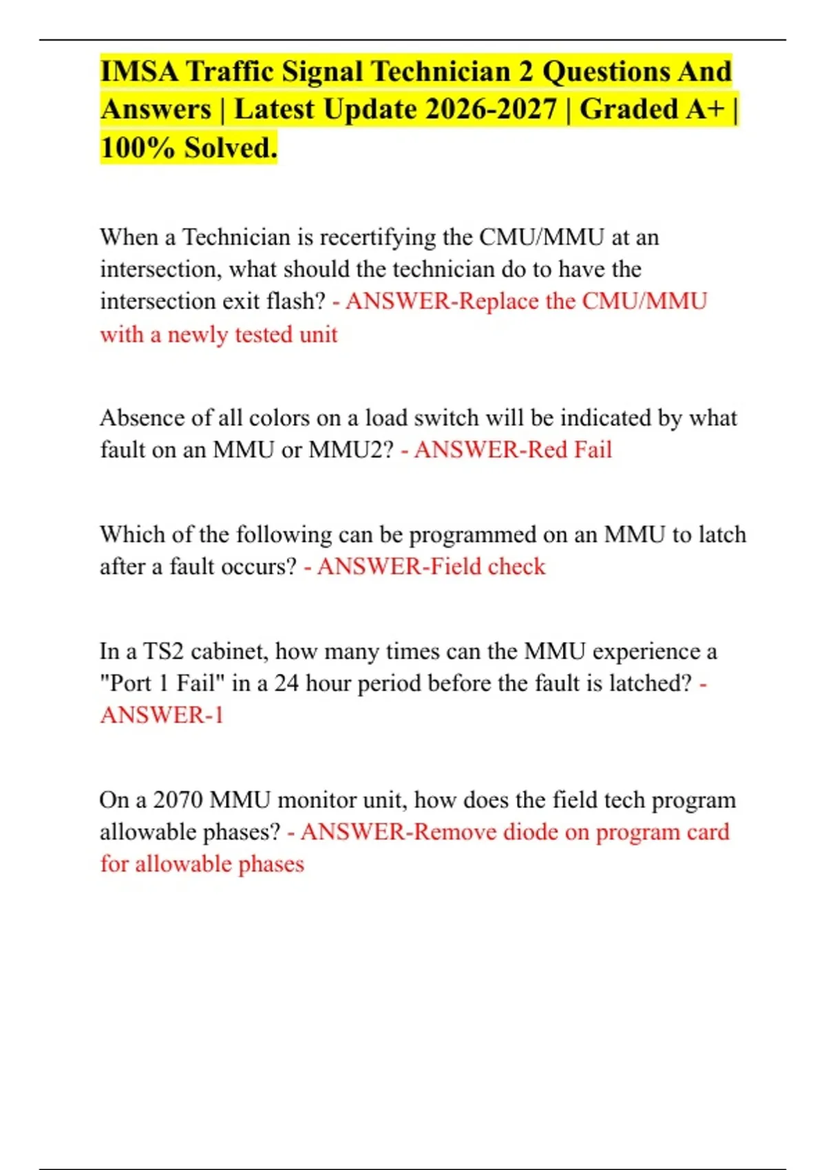 IMSA Traffic Signal Technician 2 Questions And Answers | Latest Update | Graded A+ | 100% Solved.