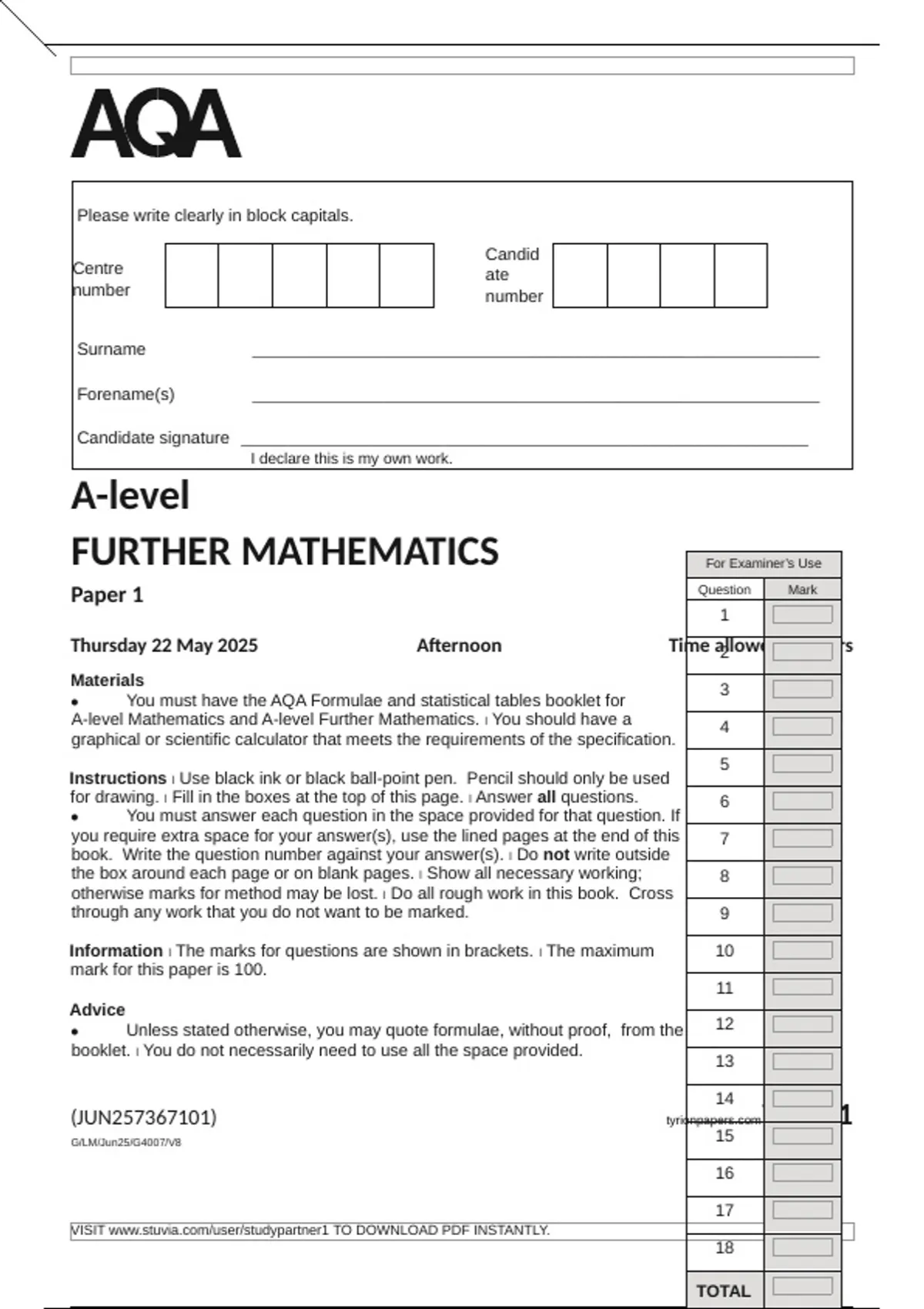 AQA A LEVEL FURTHER MATHEMATICS PAPER 1 2025 QUESTION PAPER (7367/1)