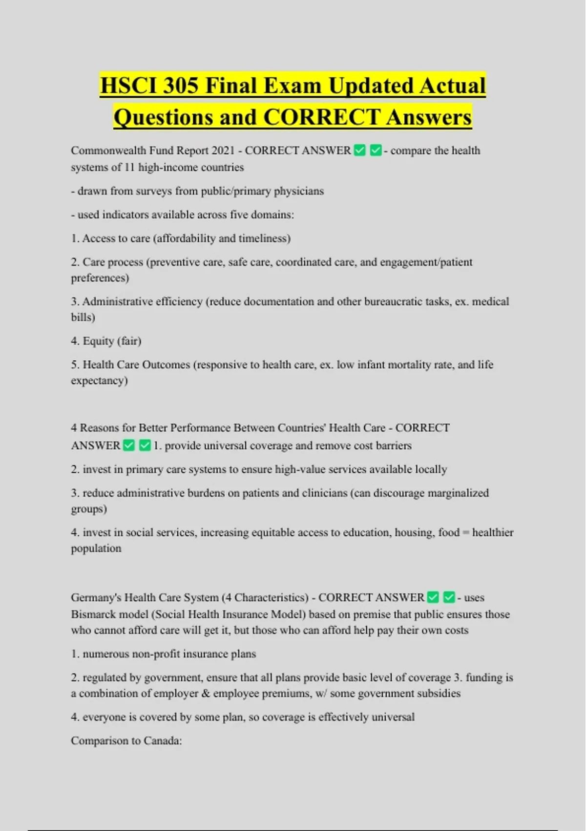 HSCI 305 Final Exam Updated Actual Questions and CORRECT Answers Commonwealth Fund Report 2021 - CORRECT ANSWER systems of 11 high-income countries - drawn from surveys from public/primary physicians - used indicators available across five domains: 1. Access to care (affordability and timeliness) - compare the health 2. Care process (preventive care, safe care, coordinated care, and engagement/patient preferences) 3. Administrative efficiency (reduce documentation and other bureaucratic tasks, ex. medical bills) 4. Equity (fair) 5. Health Care Outcomes (responsive to health care, ex. low infant mortality rate, and life expectancy) 4 Reasons for Better Performance Between Countries' Health Care - CORRECT ANSWER 1. provide universal coverage and remove cost barriers 2. invest in primary care systems to ensure high-value services available locally 3. reduce administrative burdens on patients and clinicians (can discourage marginalized groups) 4. invest in social services, increasing equitable access to education, housing, food = healthier population