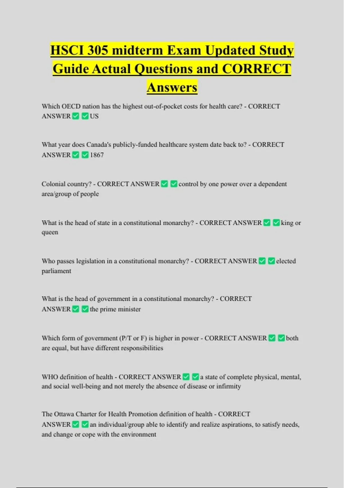 HSCI 305 midterm Exam Updated Study Guide Actual Questions and CORRECT Answers Which OECD nation has the highest out-of-pocket costs for health care? - CORRECT ANSWER US What year does Canada's publicly-funded healthcare system date back to? - CORRECT ANSWER 1867 Colonial country? - CORRECT ANSWER area/group of people control by one power over a dependent What is the head of state in a constitutional monarchy? - CORRECT ANSWER queen Who passes legislation in a constitutional monarchy? - CORRECT ANSWER parliament What is the head of government in a constitutional monarchy? - CORRECT ANSWER the prime minister
