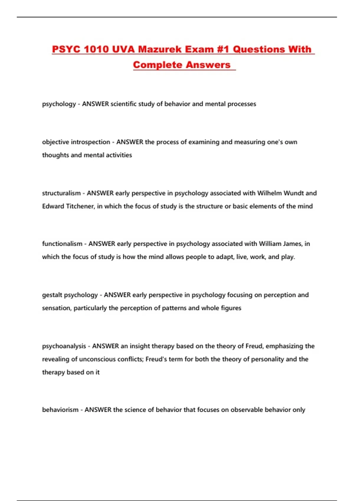 PSYC 1010 UVA Mazurek Exam #1 Questions With Complete Answers ...