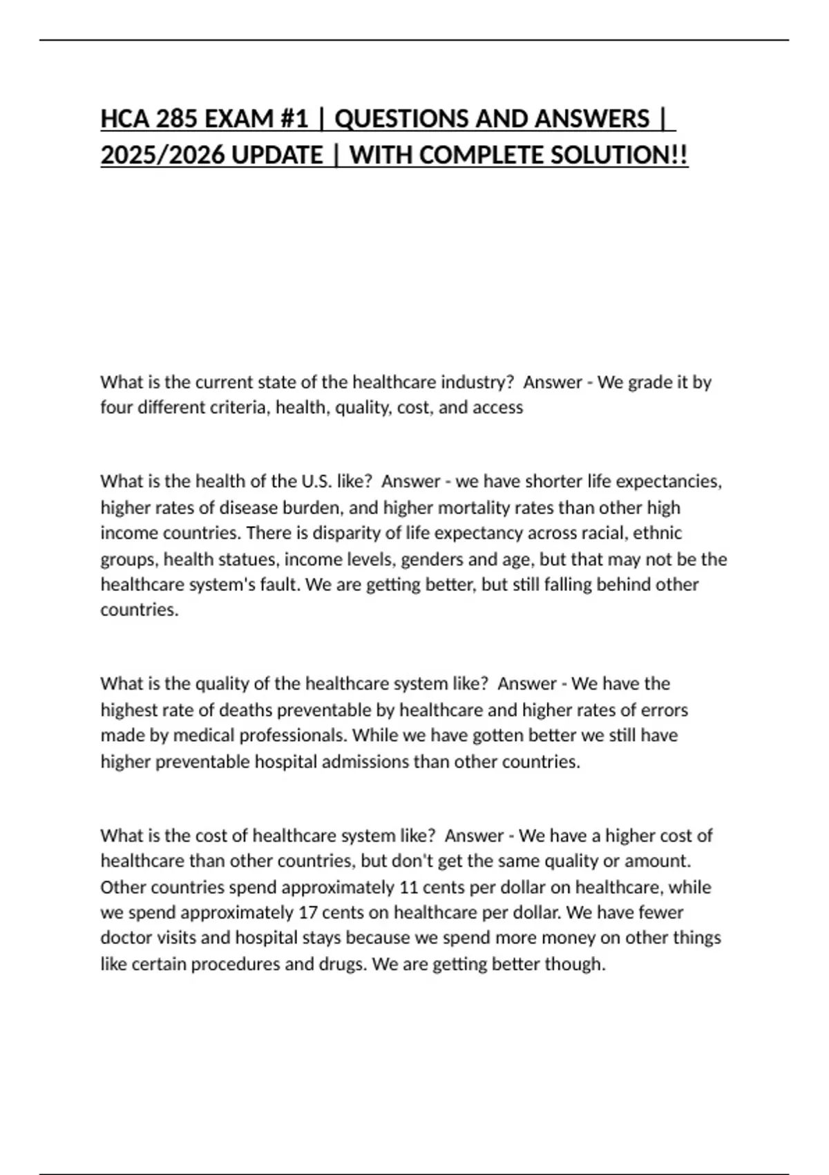 HCA 285 EXAM #1 | QUESTIONS AND ANSWERS |