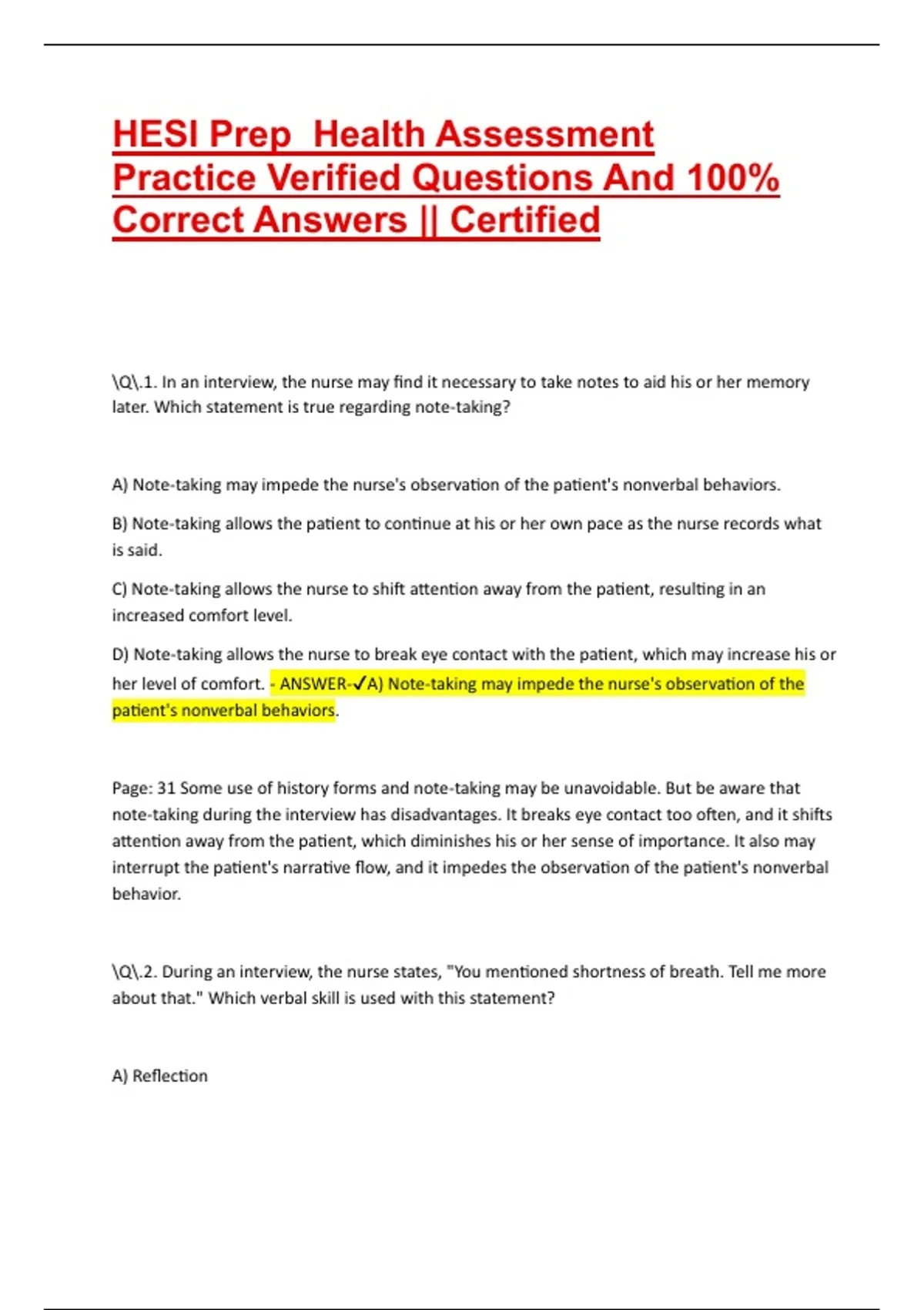 HESI Prep Health Assessment Practice Verified Questions And 100% Correct Answers || Certified
