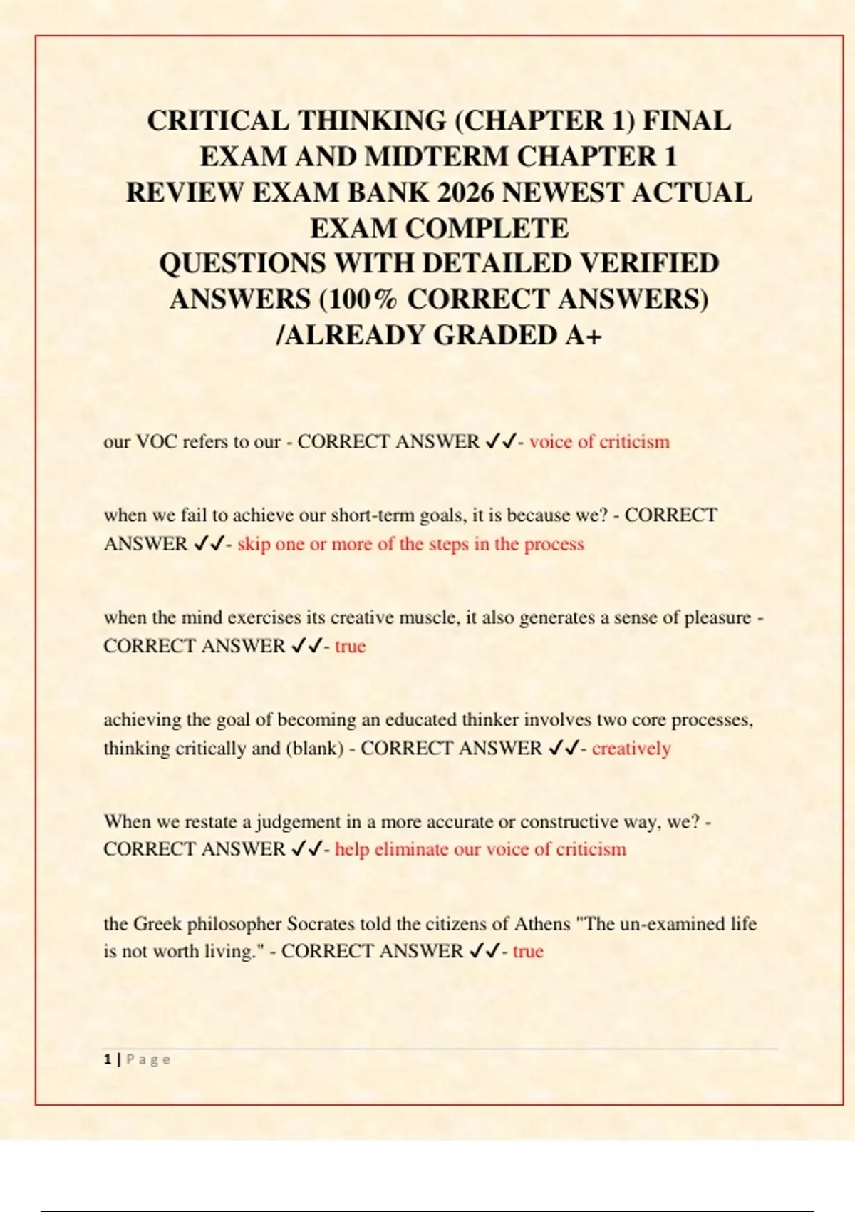 CRITICAL THINKING (CHAPTER 1) FINAL EXAM AND MIDTERM CHAPTER 1 REVIEW EXAM BANK 2026 NEWEST ACTUAL EXAM COMPLETE QUESTIONS WITH DETAILED VERIFIED ANSWERS (100% CORRECT ANSWERS) /ALREADY GRADED A+