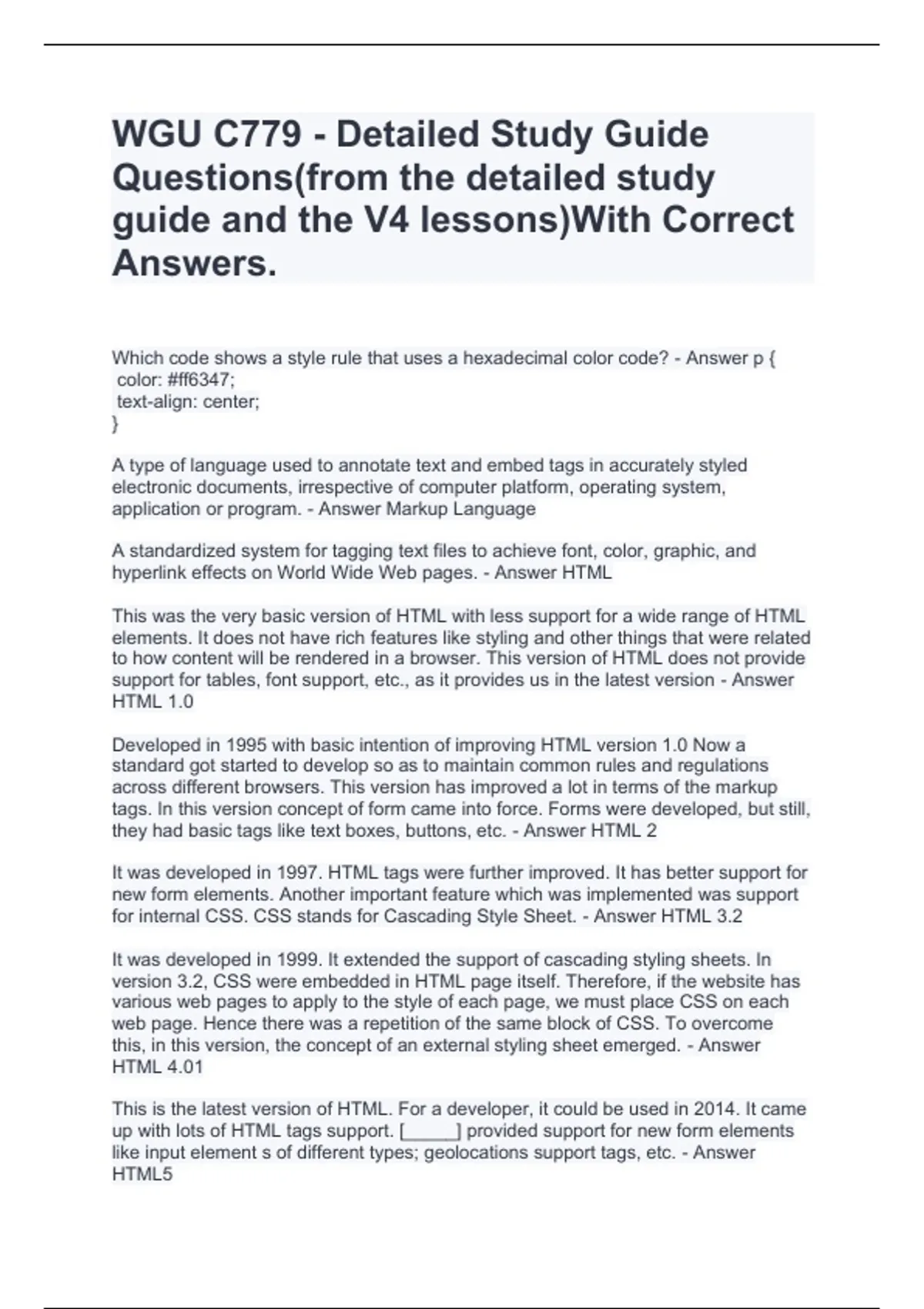 This document provides a complete and structured collection of study questions taken from the WGU C779 Detailed Study Guide and the V4 lesson materials. Each question is paired with the correct answer, covering all foundational web development topics including HTML, CSS, page structure, accessibility, design principles, and web standards. It is designed to fully support students preparing for the C779 Objective Assessment by offering accurate, exam-aligned content.