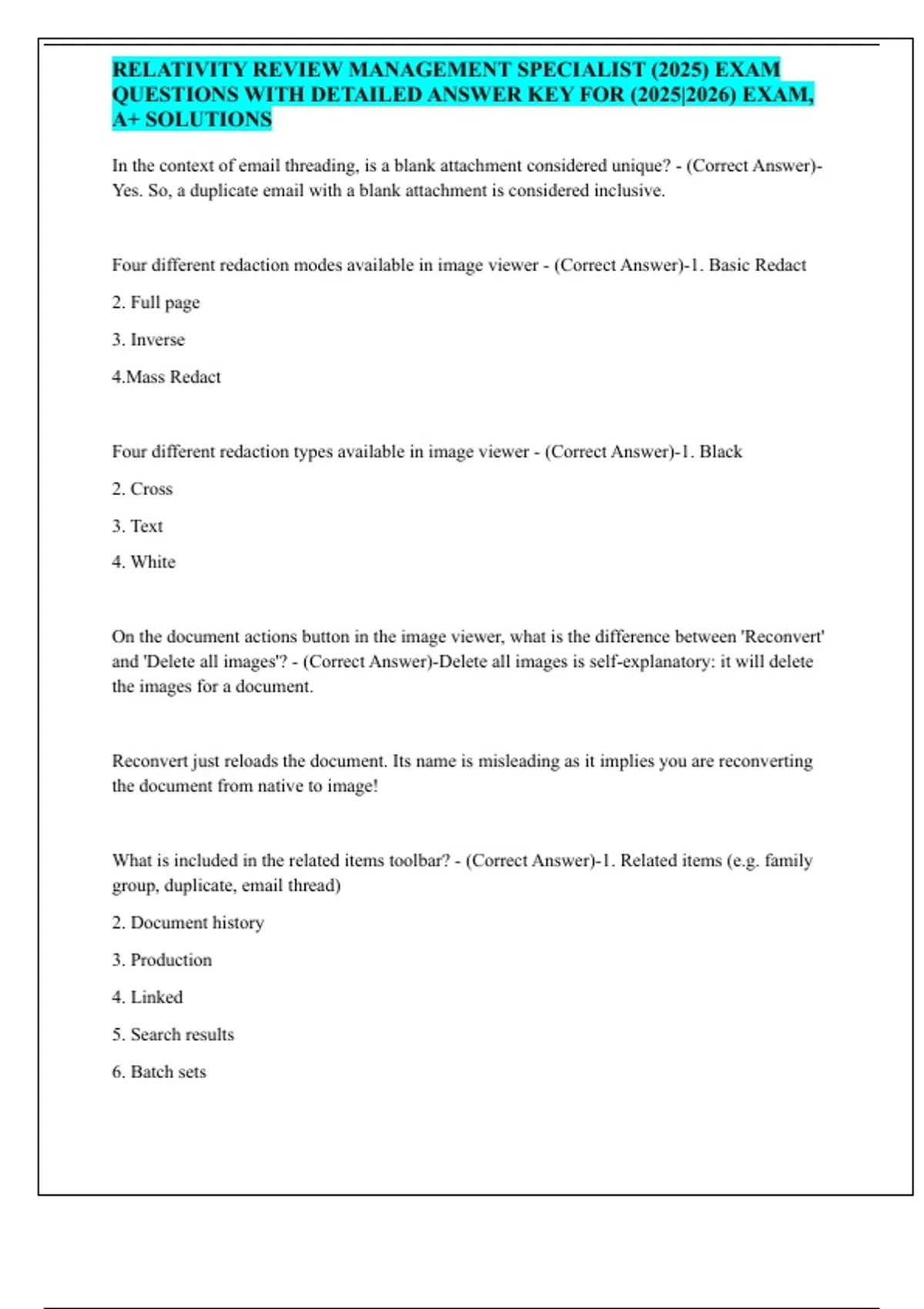 Relativity Review Management Specialist (2025) EXAM QUESTIONS WITH Detailed Answer Key For (2025|2026) Exam, A+ Solutions