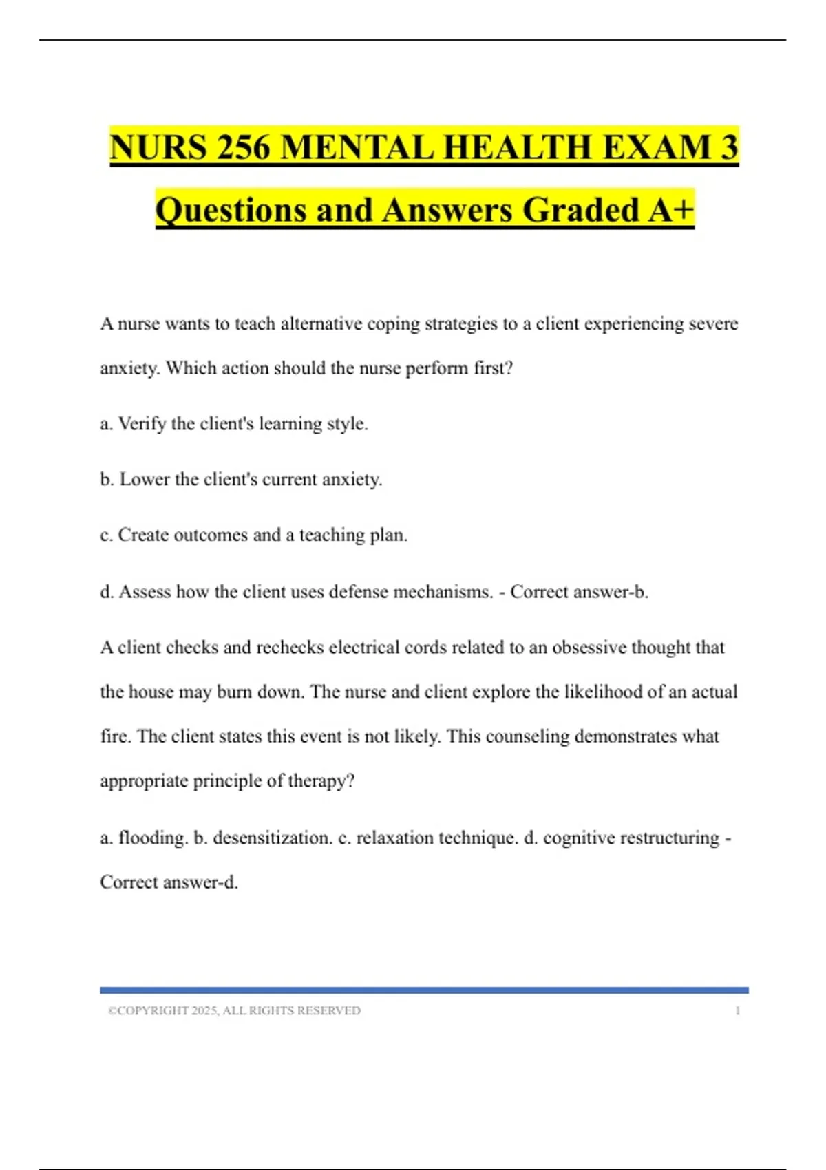 NURS 256 MENTAL HEALTH EXAM 3 Questions and Answers Graded A+