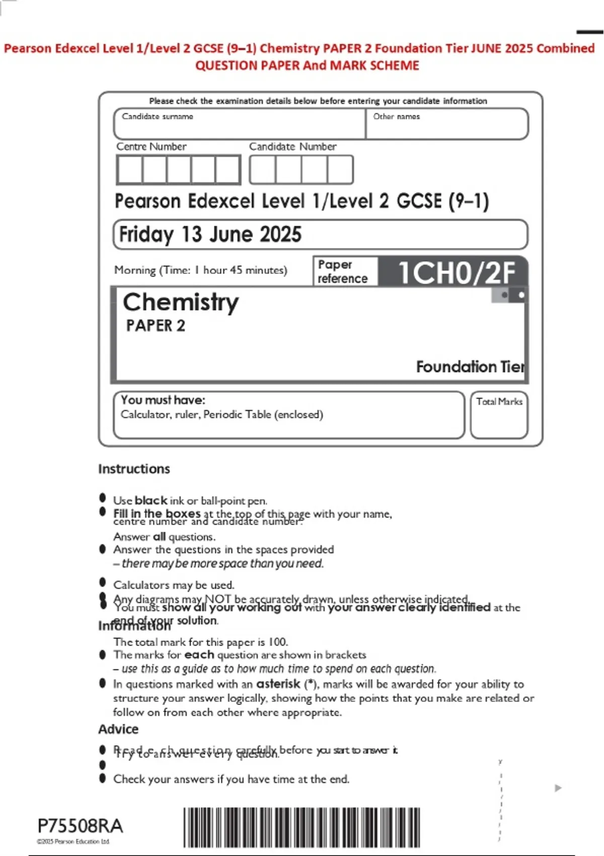 Pearson Edexcel Level 1/Level 2 GCSE (9–1) Chemistry PAPER 2 Foundation Tier JUNE 2025 Combined QUESTION PAPER And MARK SCHEME