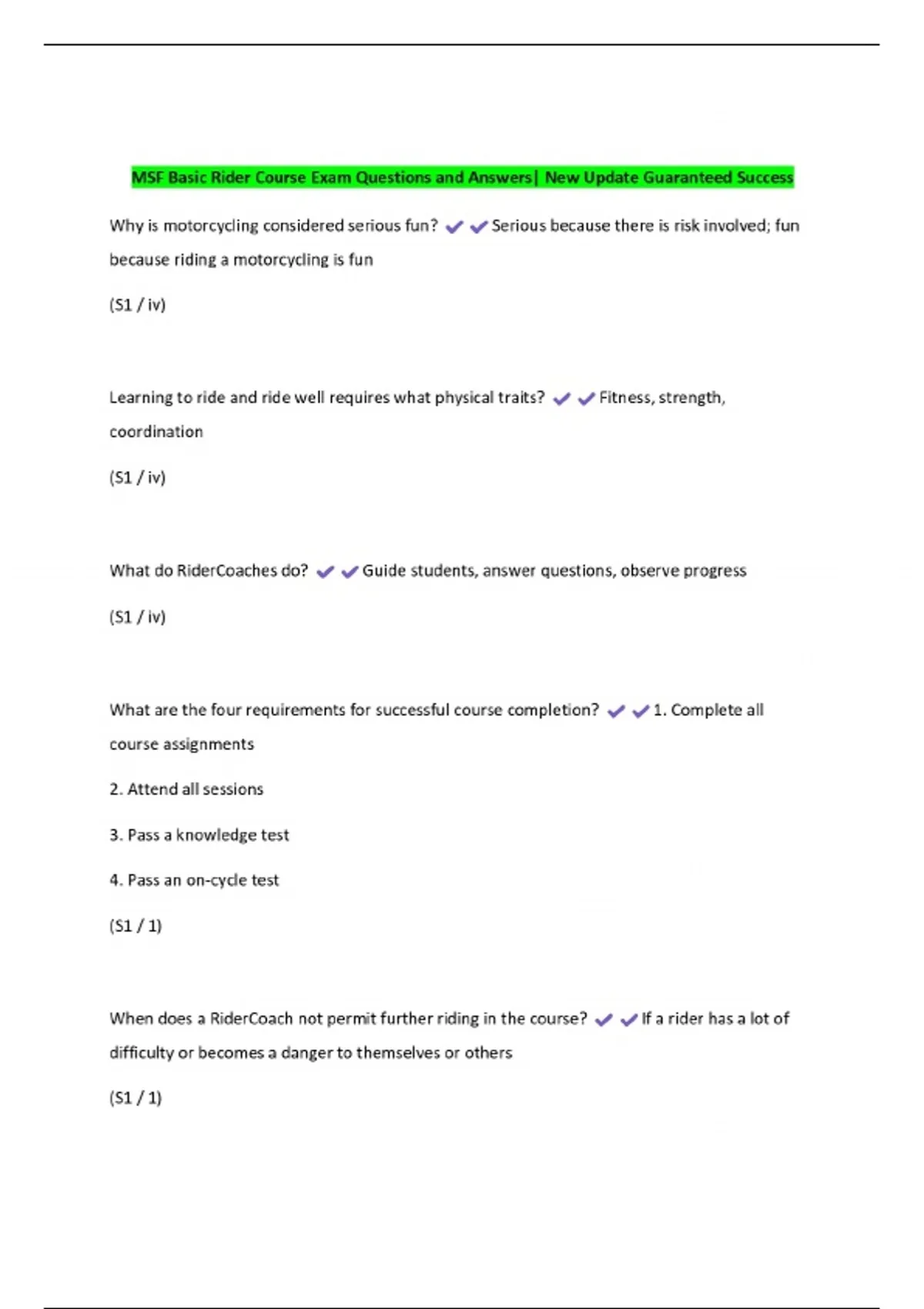 MSF Basic Rider Course Exam Questions and Answers| New Update Guaranteed Success