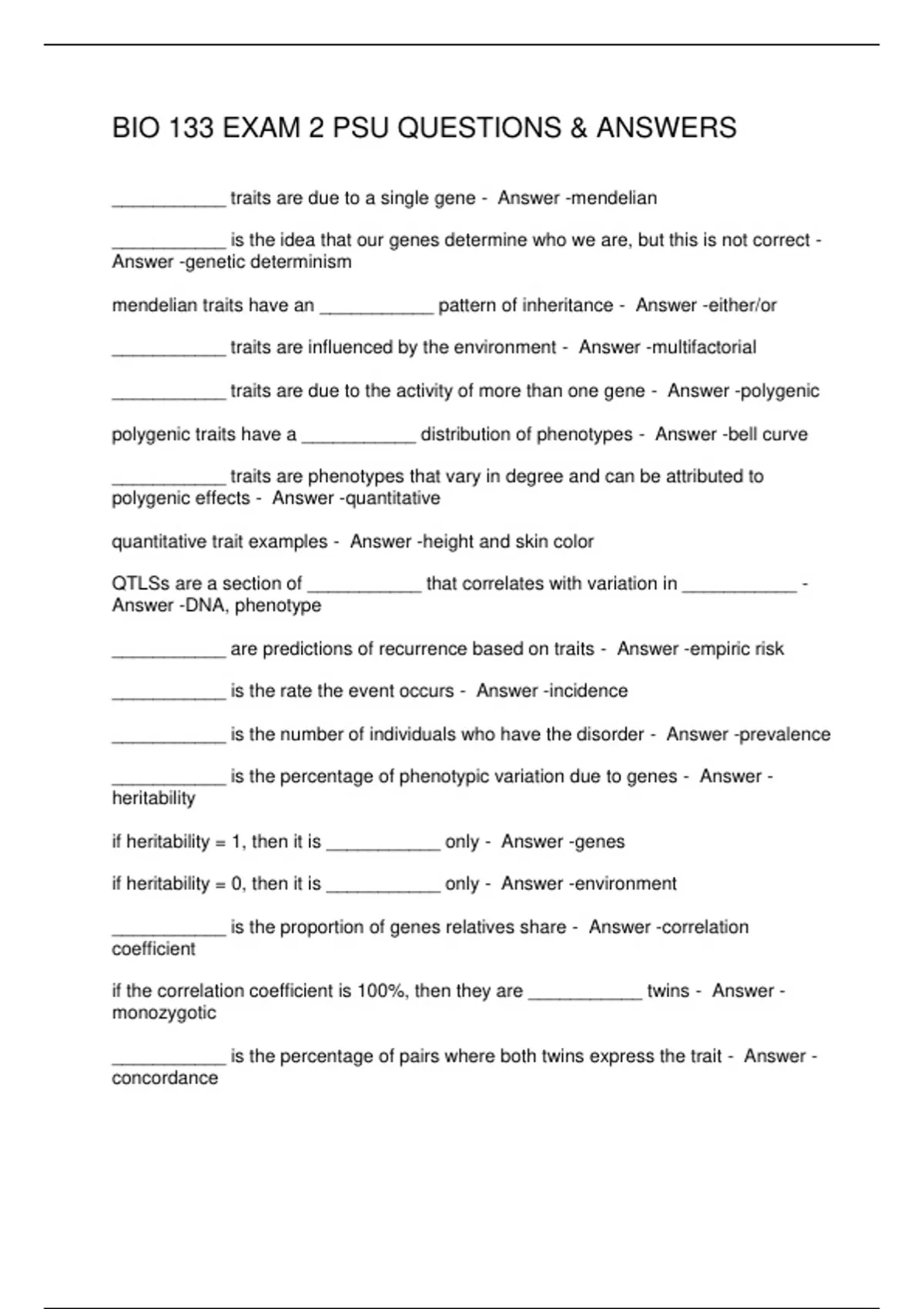 BIO 133 EXAM 2 PSU QUESTIONS & ANSWERS