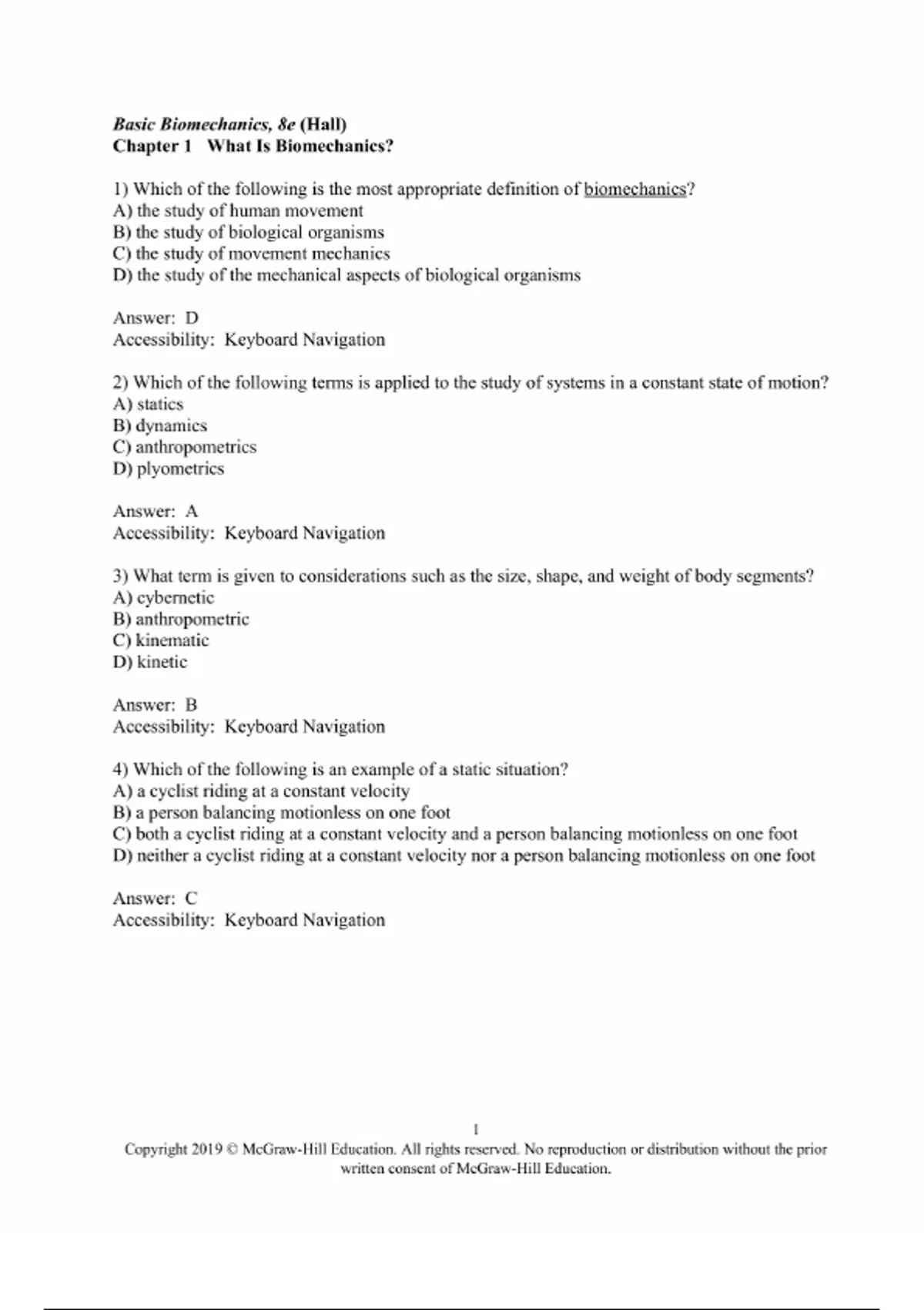 Test Bank For Basic Biomechanics 8Th Edition By Susan, Chapter 1-15 Complete Guide.1 What is Biomechanics? 2 Kinematic Concepts for Analyzing Human Motion 3 Kinetic Concepts for Analyzing Human Motion 4 The Biomechanics of Human Bone Growth and Development 5 The Biomechanics of Human Skeletal Articulations 6 The Biomechanics of Human Skeletal Muscle 7 The Biomechanics of the Human Upper Extremity 8 The Biomechanics of the Human Lower Extremity 9 The Biomechanics of the Human Spine 10 Linear Kinematics of Human Movement 11 Angular Kinematics of Human Movement 12 Linear Kinetics of Human Movement 13 Equilibrium and Human Movement 14 Angular Kinetics of Human Movement 15 Human Movement in a Fluid Medium