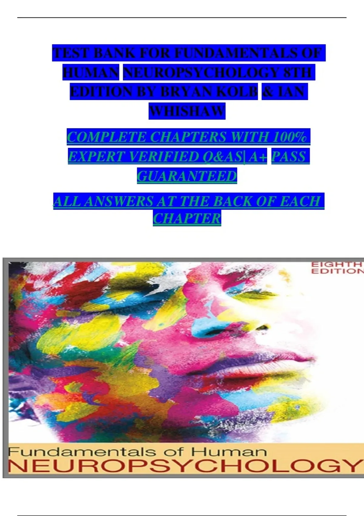 Title: Fundamentals of Human Neuropsychology – 8th Edition (Bryan Kolb & Ian Whishaw) – Comprehensive Test Bank with Questions and Answers
