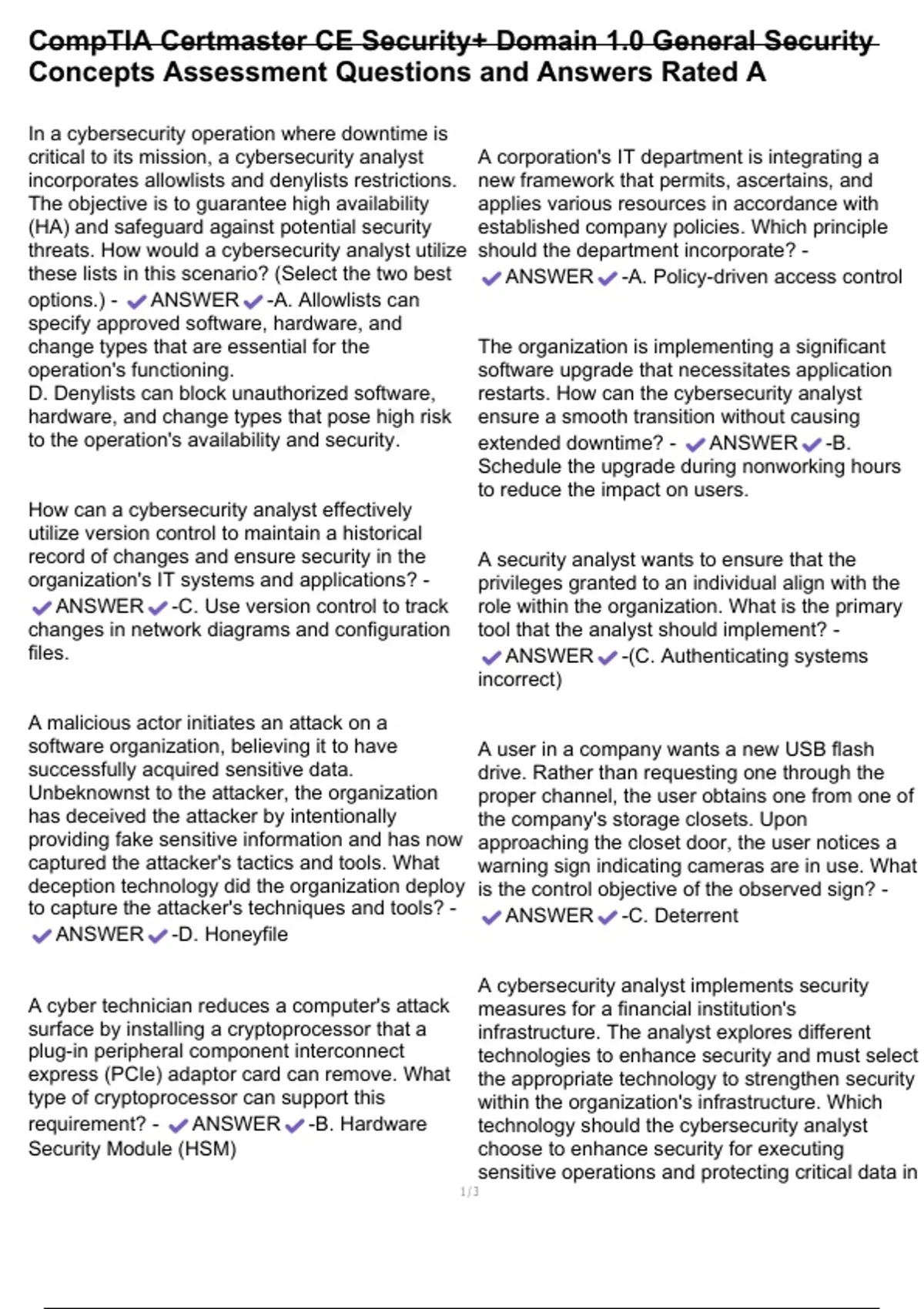 CompTIA Certmaster CE Security+ Domain 1.0 General Security Concepts Assessment Questions and Answers Rated A