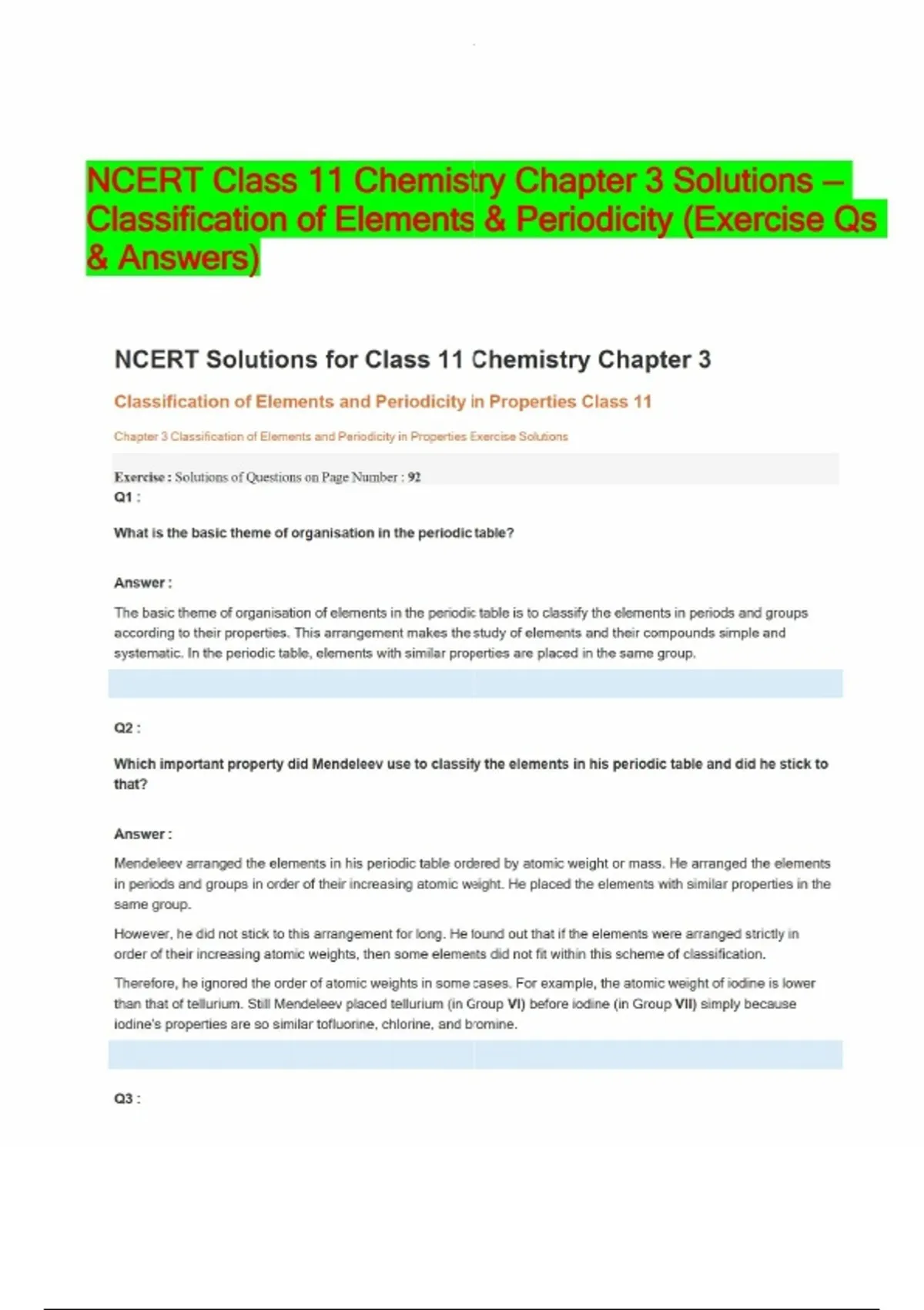 NCERT Class 11 Chemistry Chapter 3 Solutions — Classification of Elements & Periodicity (Exercise Qs & Answers)