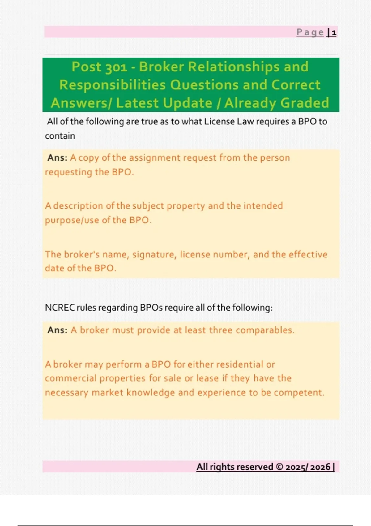 This document provides the latest updated set of questions and correct verified answers for the Post 301 course on Broker Relationships and Responsibilities. It covers key topics including agency relationships, fiduciary duties, broker responsibilities, recordkeeping, disclosures, licensing requirements, and ethical practice standards. Taken from an already graded version, this resource offers accurate, exam-ready content ideal for students preparing for real estate post-licensing assessments or seeking a comprehensive study guide.