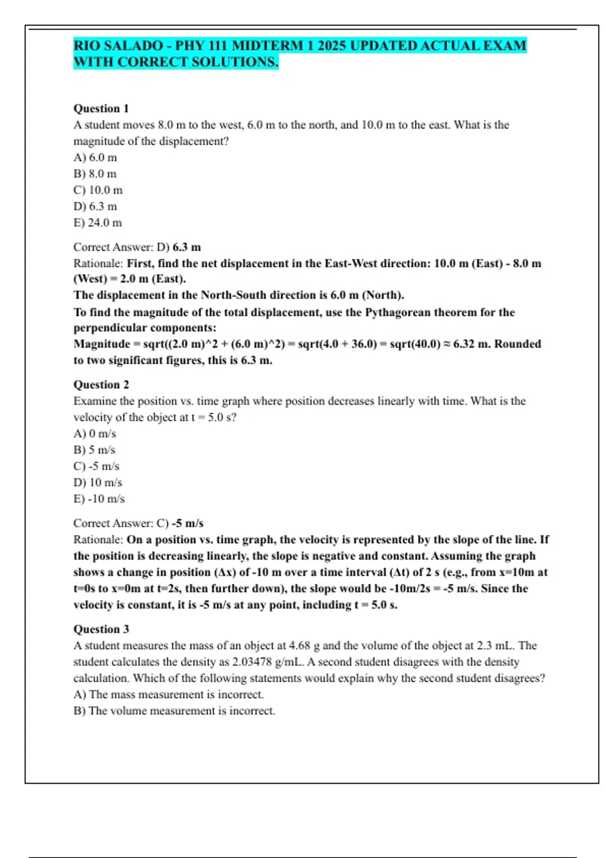 RIO SALADO - PHY 111 MIDTERM 1 2025 UPDATED ACTUAL EXAM