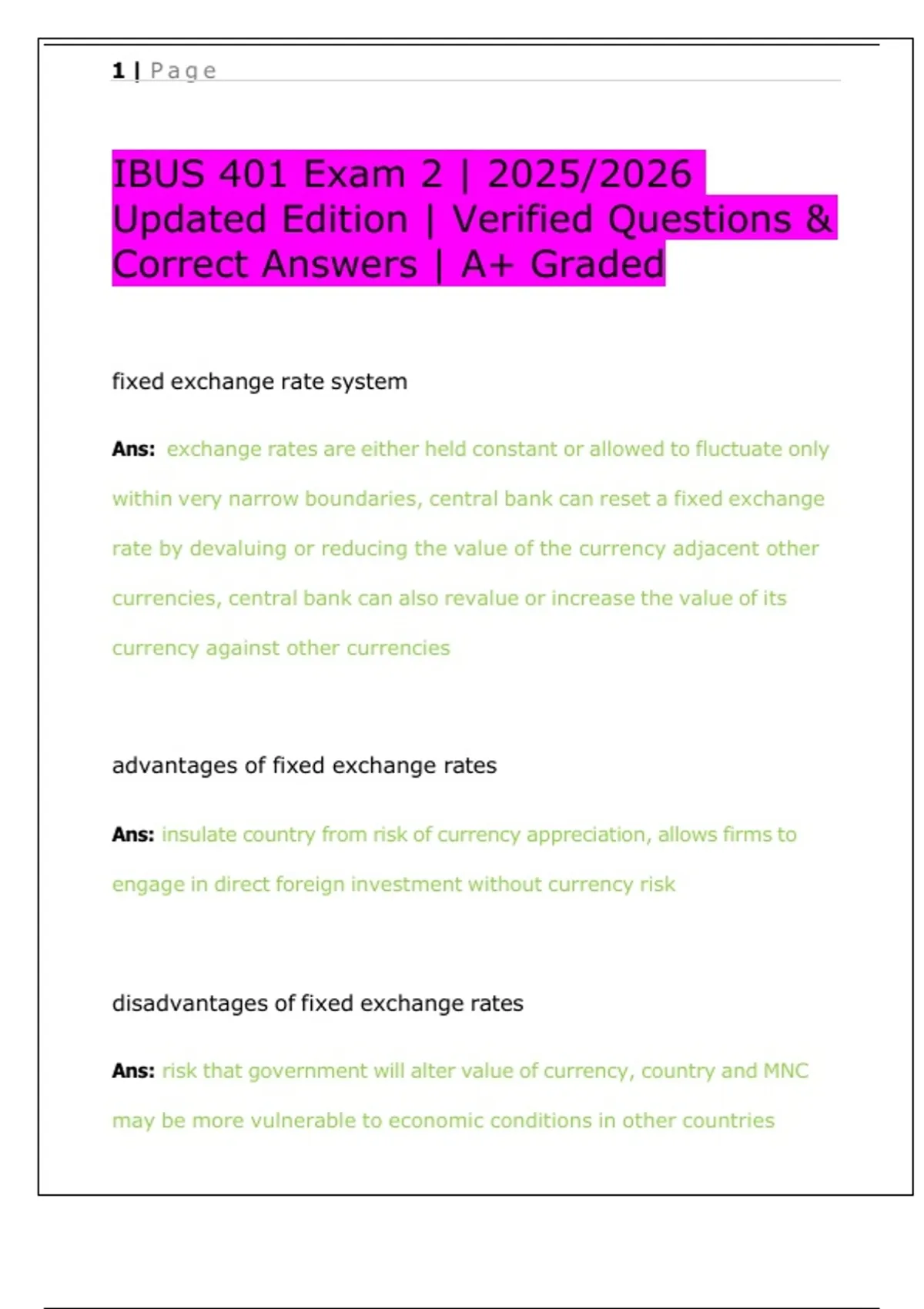 An updated set of Exam 2 questions for IBUS 401. Perfect for mastering global finance, exchange rates, international institutions, and ethical global practices. Includes verified correct answers and easy-to-understand explanations.