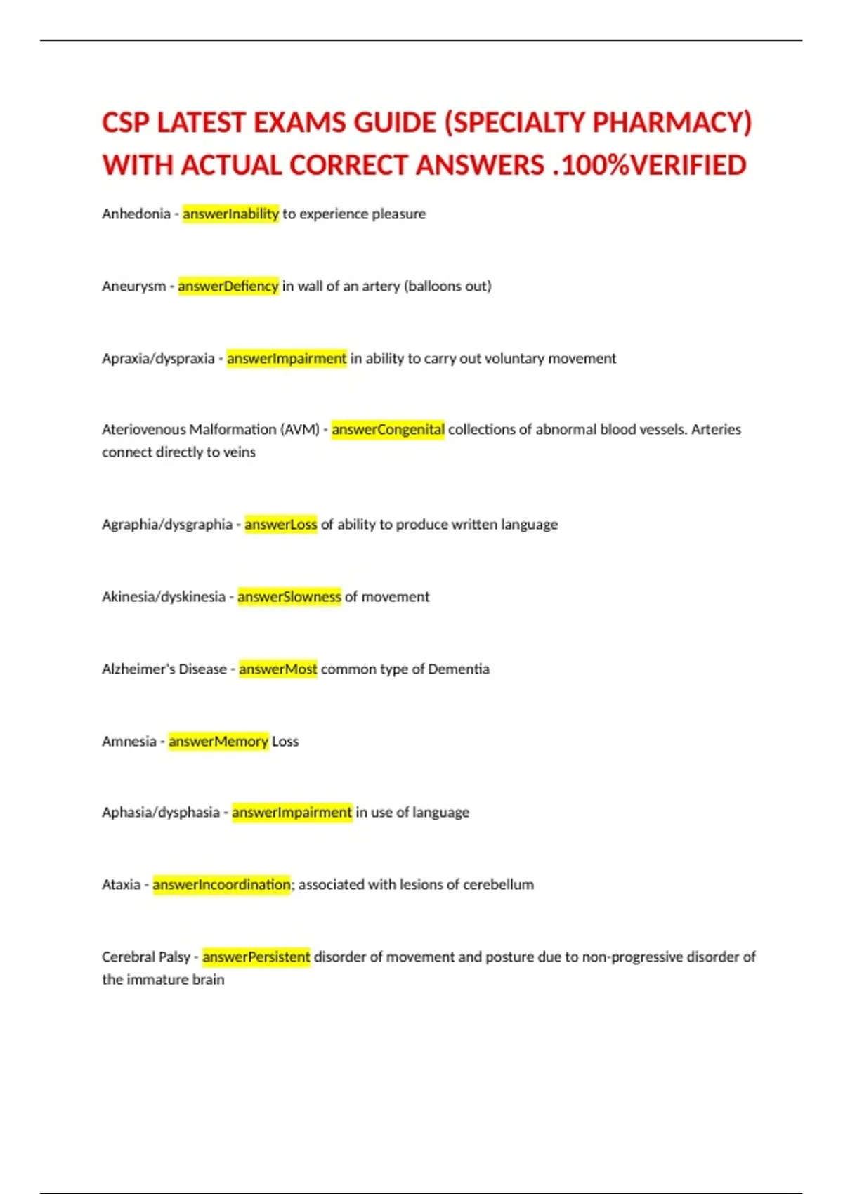 CSP LATEST EXAMS GUIDE (SPECIALTY PHARMACY) WITH ACTUAL CORRECT ANSWERS .100%VERIFIED