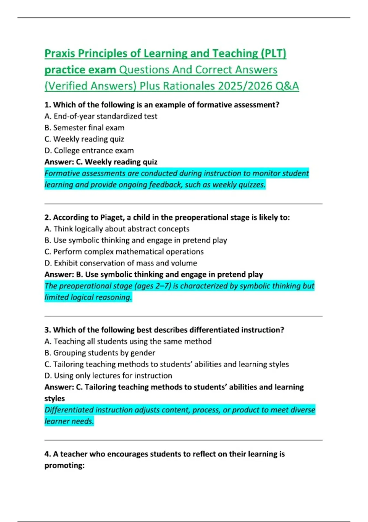 Praxis Principles of Learning and Teaching (PLT) practice exam Questions And Correct Answers (Verified Answers) Plus Rationales 2025/2026 Q&A