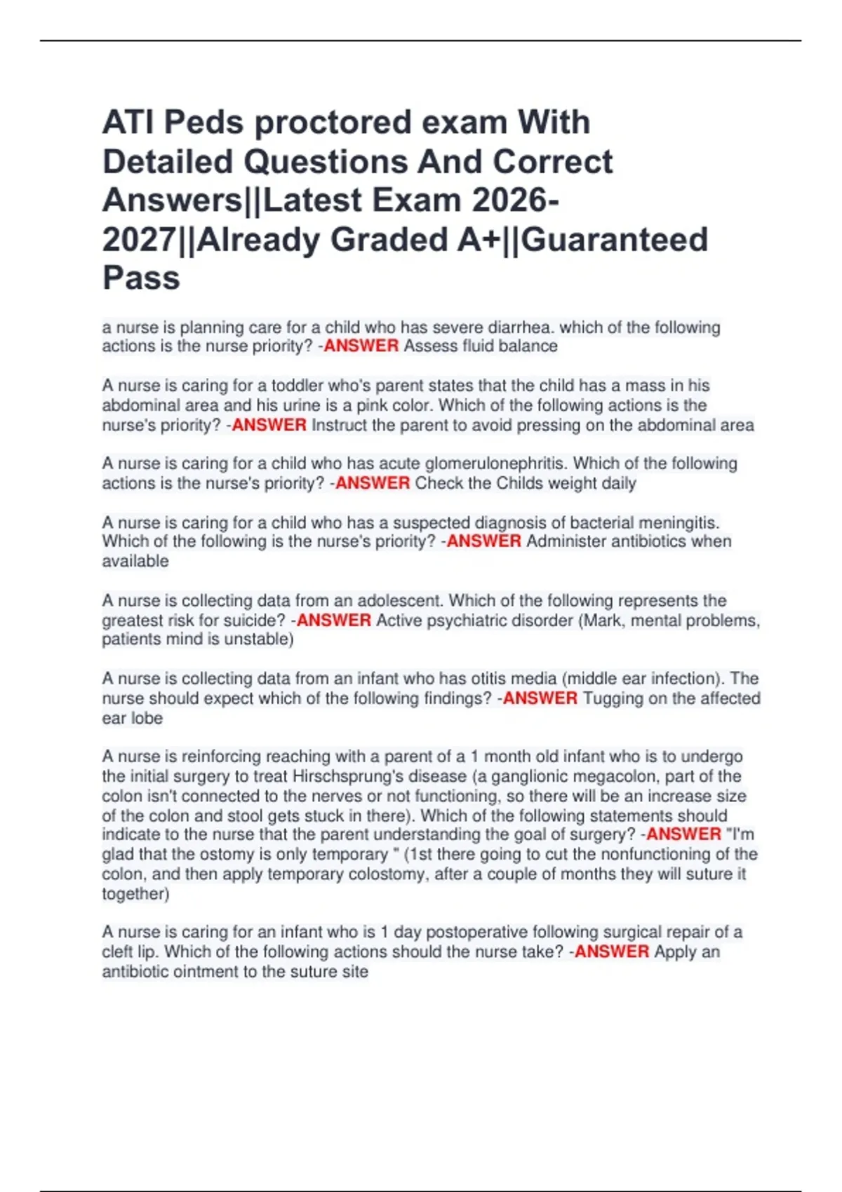 ATI Peds proctored exam With Detailed Questions And Correct Answers||Latest Exam 2026 2027||Already Graded A+||Guaranteed Pass