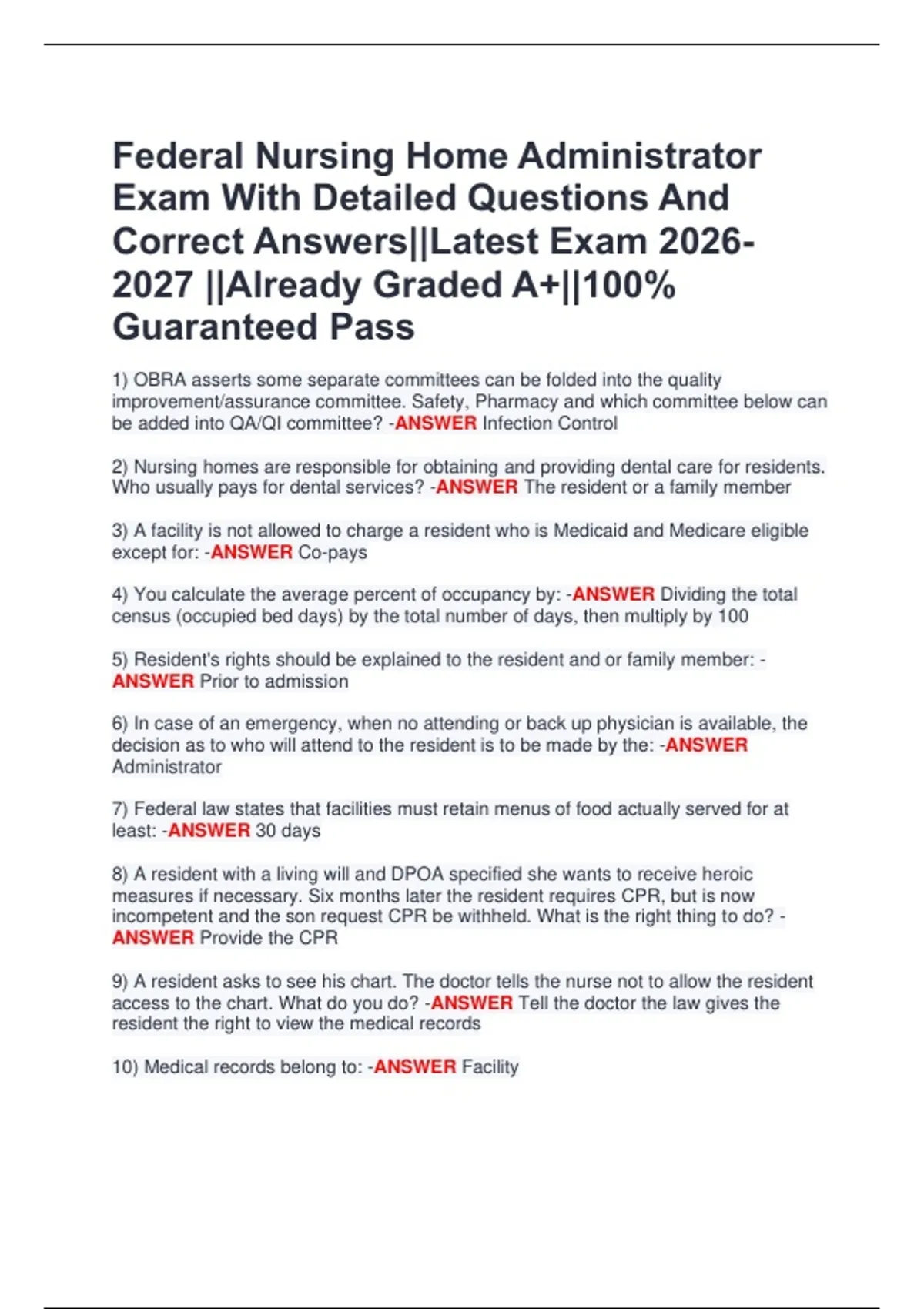 Federal Nursing Home Administrator Exam With Detailed Questions And Correct Answers||Latest Exam 2026 2027 ||Already Graded A+||100% Guaranteed Pass