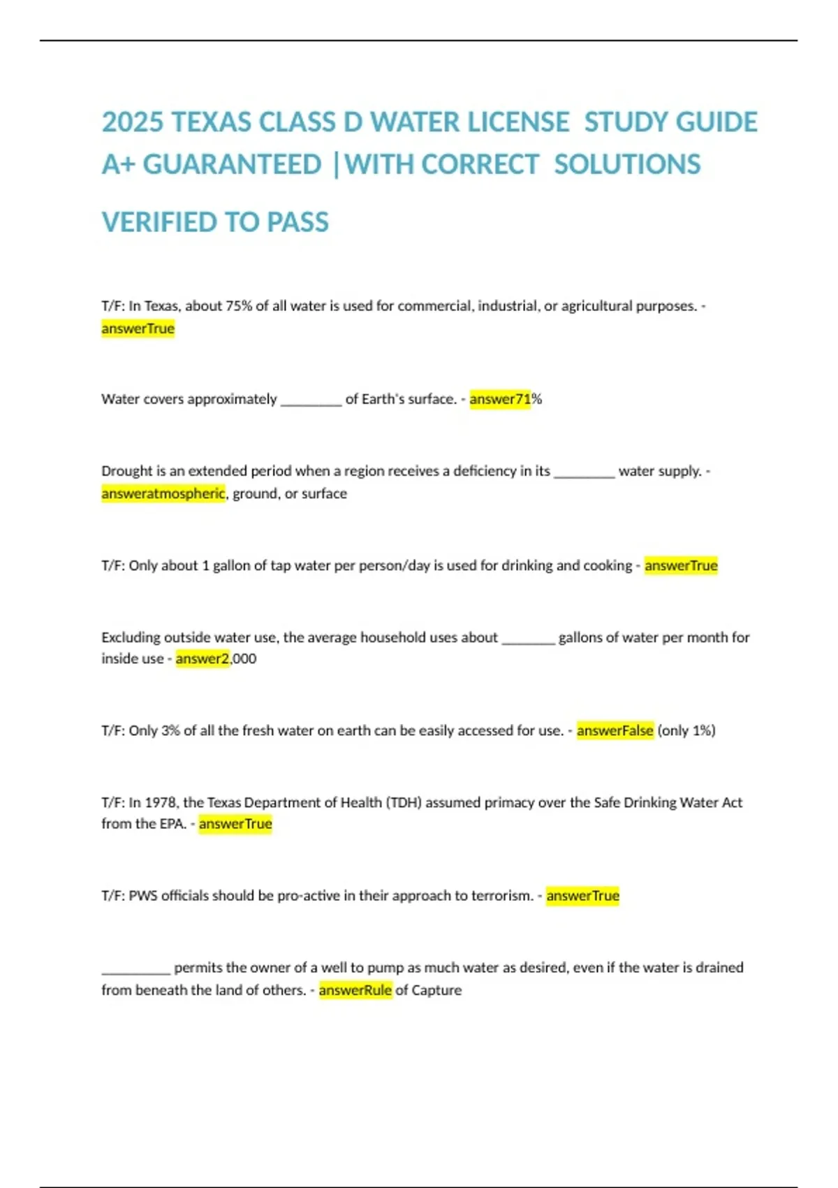 2025 TEXAS CLASS D WATER LICENSE STUDY GUIDE A+ GUARANTEED |WITH CORRECT SOLUTIONS VERIFIED TO PASS