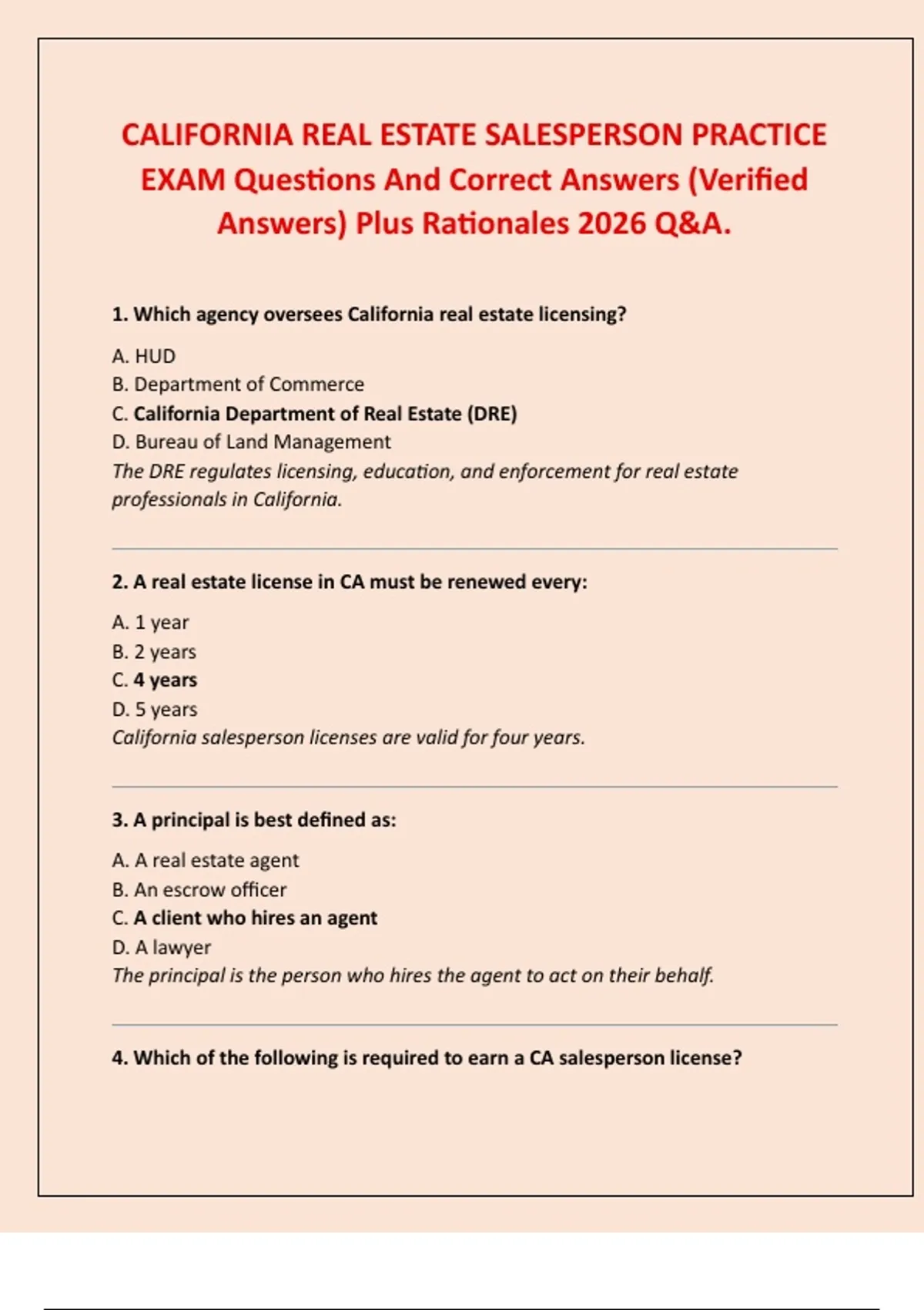 4. Which of the following is required to earn a CA salesperson license?