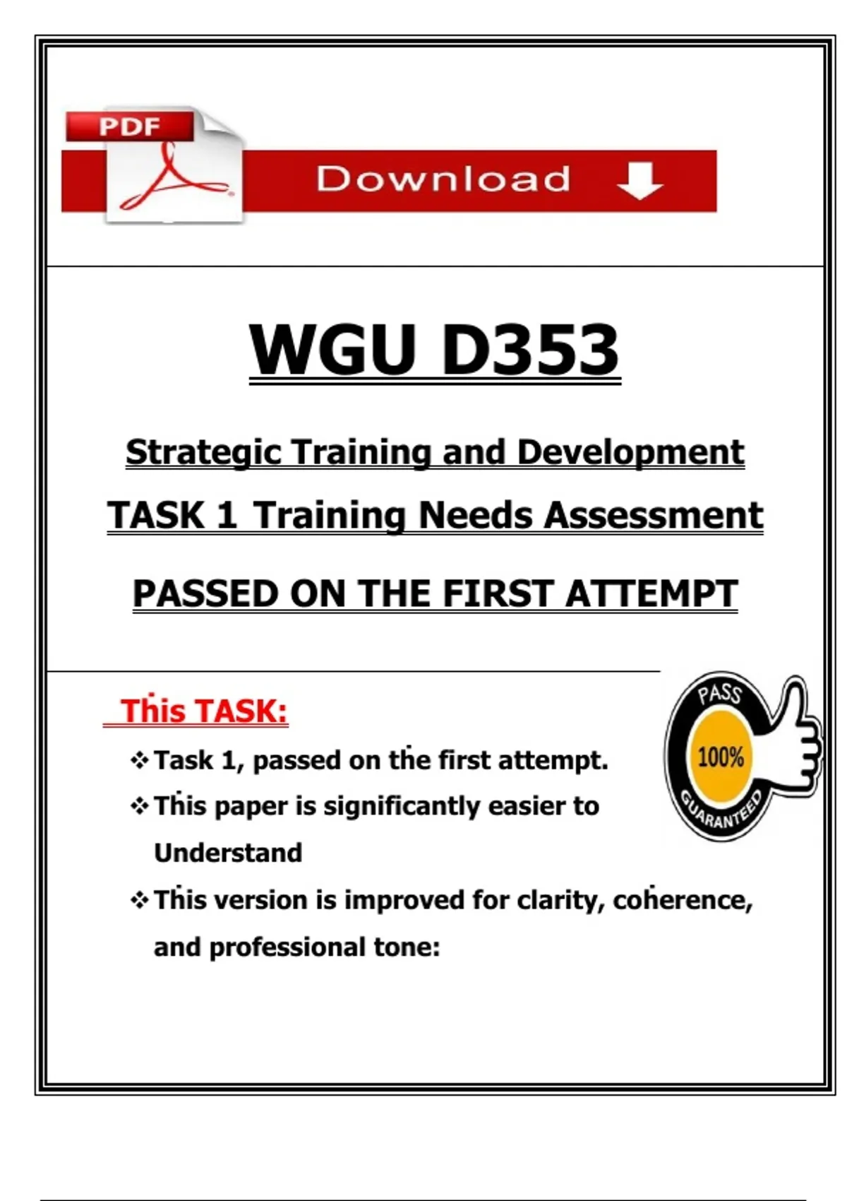 itle: WGU D353 – Strategic Training and Development – Task 1 – Training Needs Assessment with SWOT & Learning Theory (Passed) Description: This document is a completed and passed Task 1 submission for WGU’s D353 course, Strategic Training and Development. It includes a full training needs assessment using direct observation, interviews, and existing documentation. The paper features a comprehensive SWOT analysis, application of Constructivism learning theory, and legal compliance guidance aligned with Title VII. Perfect for students seeking a well-structured, real-world example. Keywords: WGU, D353, Task 1, training needs assessment, SWOT analysis, strategic training, learning theory, Constructivism, problem-based learning, communities of practice, Title VII compliance, employee retention, floor agents, training development