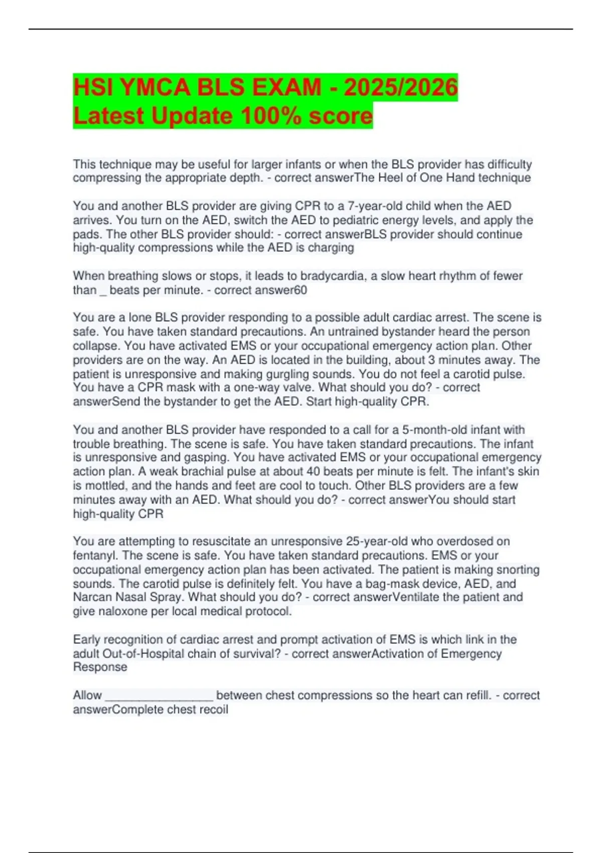 Prepare to ace the HSI YMCA Basic Life Support (BLS) Exam with this fully updated 2025/2026 study and practice guide. Designed for healthcare providers, students, and first responders, this resource offers exam-style questions, verified answers, and complete step-by-step instructions, ensuring you are fully prepared to achieve top scores. This guide covers all essential BLS topics, including adult, child, and infant CPR, AED operation, choking relief, rescue breathing, and team-based emergency response protocols. The included 100% score examples make it easier to understand key concepts and replicate success on the exam. What’s Included ️ Updated 2025/2026 HSI YMCA BLS exam questions ️ Verified answers with clear explanations ️ Step-by-step CPR and AED guidance ️ Adult, child, and infant emergency scenarios ️ High-yield notes for last-minute review ️ Designed for first-time test-takers and recertification Best For Nursing students and healthcare trainees EMTs, paramedics, and first responders Medical assistants and healthcare providers Anyone preparing for the HSI YMCA BLS Exam This guide ensures you master lifesaving skills and enter your BLS exam confident, prepared, and ready to achieve top scores.