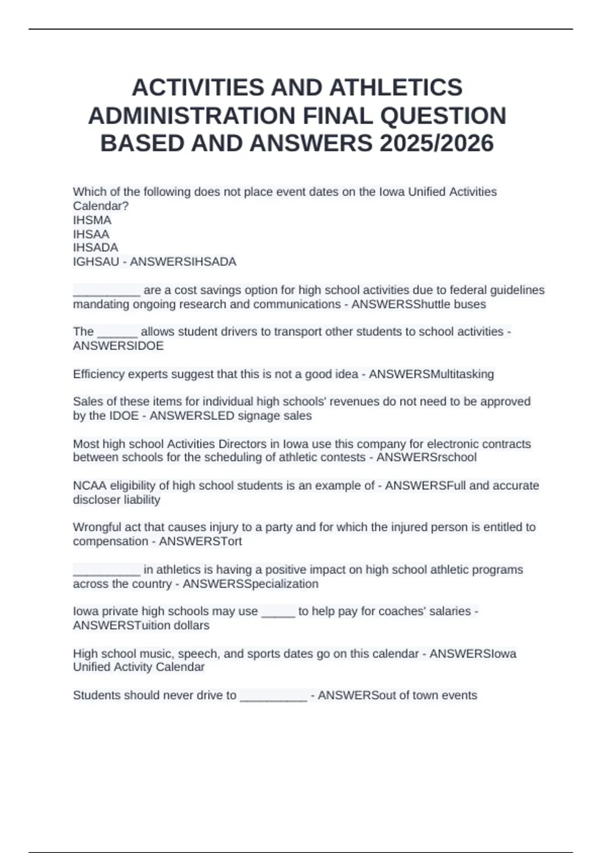 ACTIVITIES AND ATHLETICS ADMINISTRATION FINAL QUESTION BASED AND ANSWERS 2025/2026
