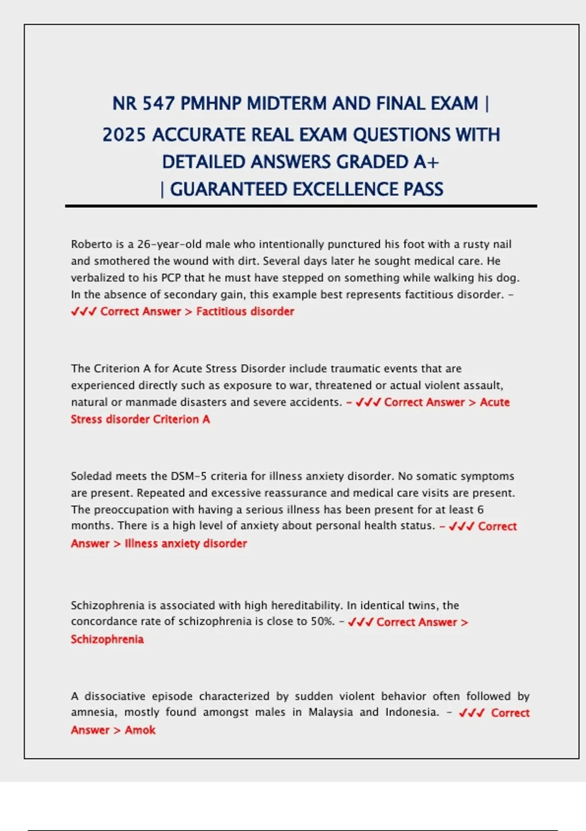 ✔✔✔ Correct Answer > Factitious disorder