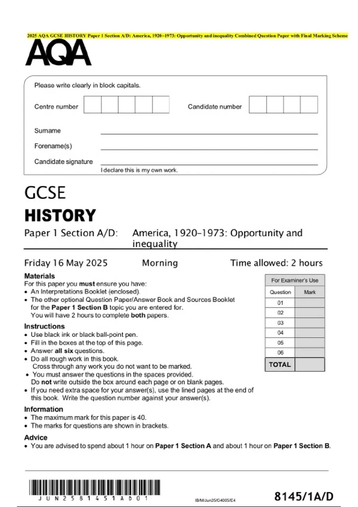 2025 AQA GCSE HISTORY Paper 1 Section A/D: America, 1920–1973: Opportunity and inequality Combined Question Paper with Final Marking Scheme
