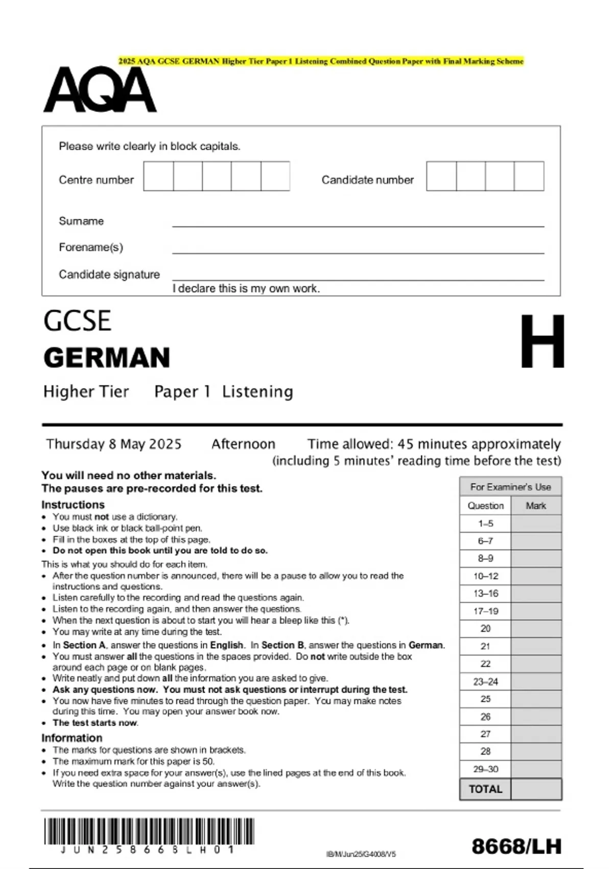 2025 AQA GCSE GERMAN Higher Tier Paper 1 Listening Combined Question Paper with Final Marking Scheme