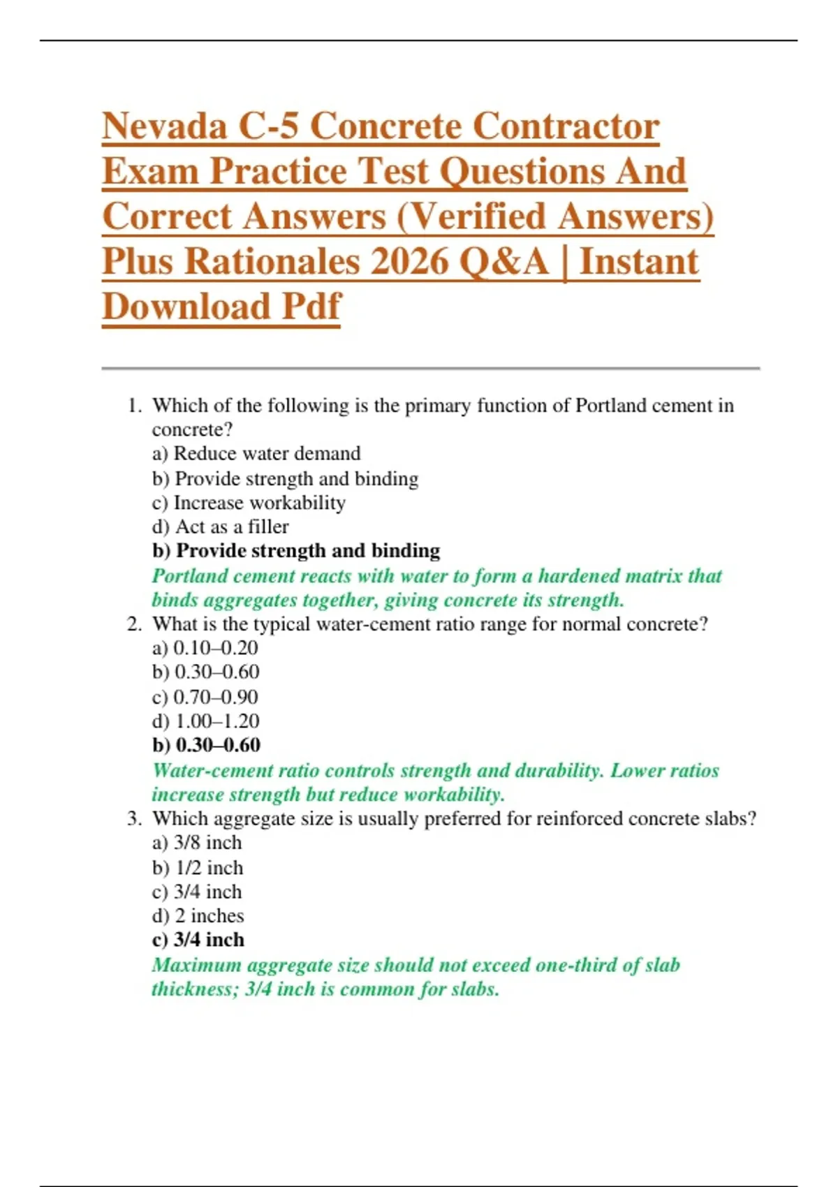 Nevada C-5 Concrete Contractor Exam Practice Test Questions And Correct Answers (Verified Answers) Plus Rationales 2026 Q&A | Instant Download Pdf